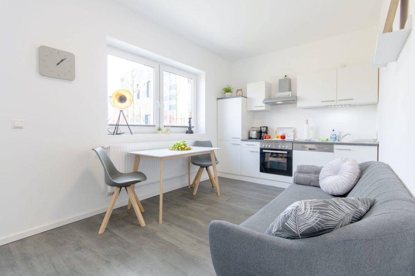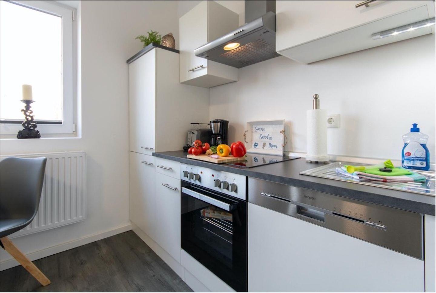Die zum Wohnbereich offene Küche ist mit einem Esstisch, 4er-Cerankochfeld, Backofen, Geschirrspülmaschine, Wasserkocher, Kaffeemaschine, Toaster und Kühlschrank mit Eisfach ausgestattet. Selbstverständlich sind ausreichend Geschirr sowie die üblichen Utensilien einer Küche vorhanden.