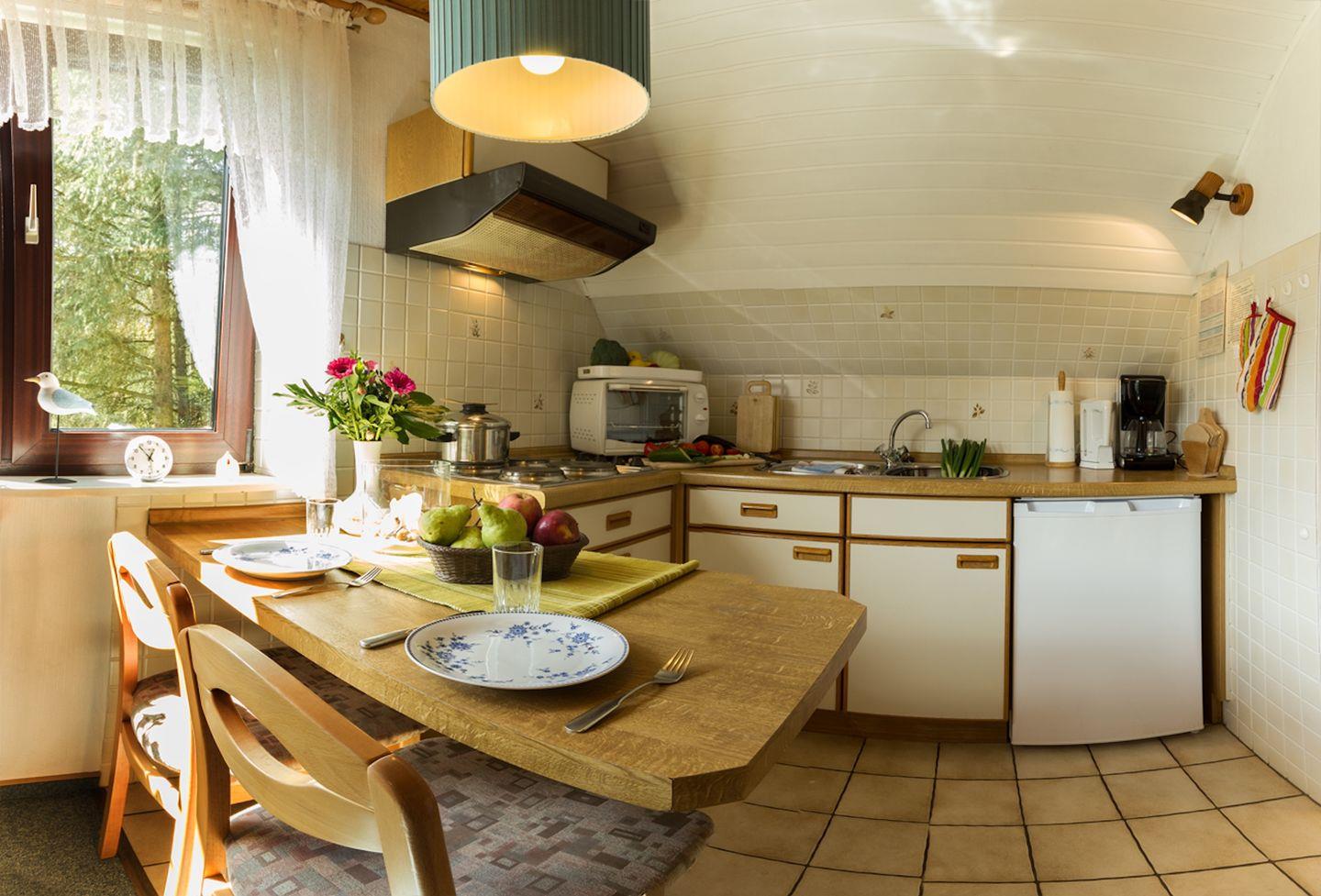 Die im Wohnzimmer integrierte Küchenzeile ist mit einem Esstisch, 4-Platten-Kochfeld, Wasserkocher, Kaffeemaschine, Toaster, Eierkocher, kleinem Umluftbackofen und Kühlschrank mit Eisfach ausgestattet. Selbstverständlich sind ausreichend Geschirr sowie die üblichen Utensilien einer Küche vorhanden.