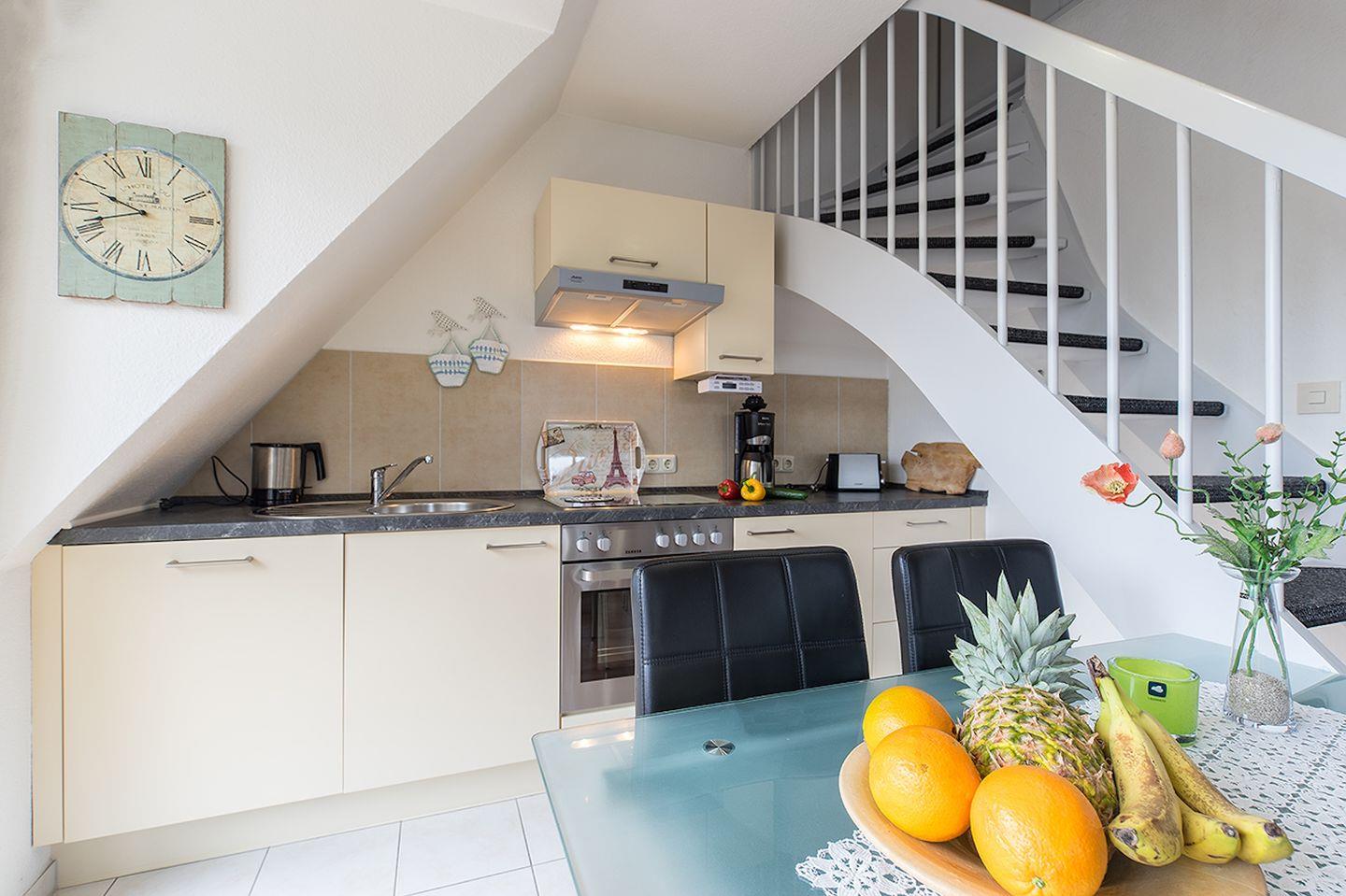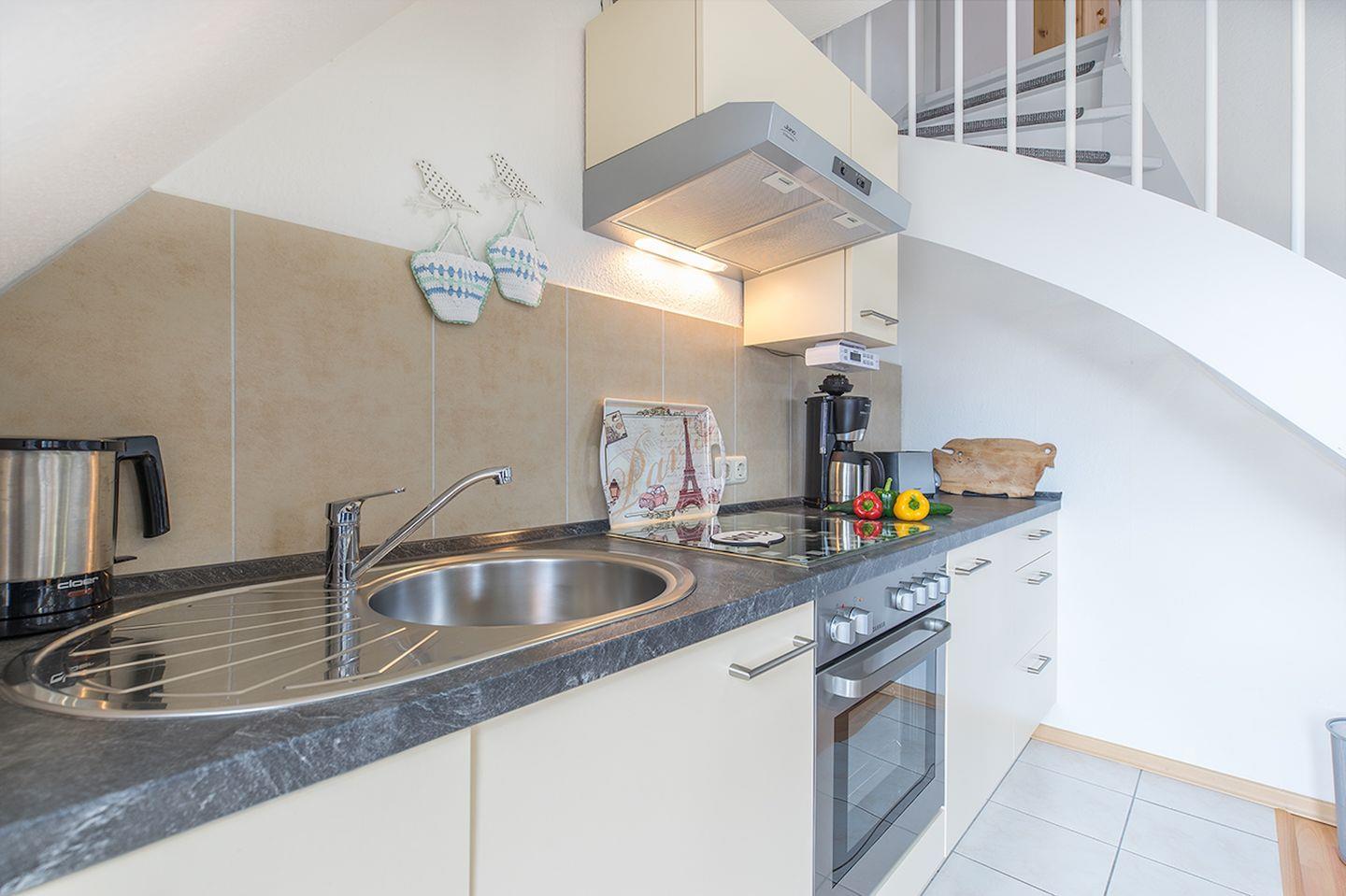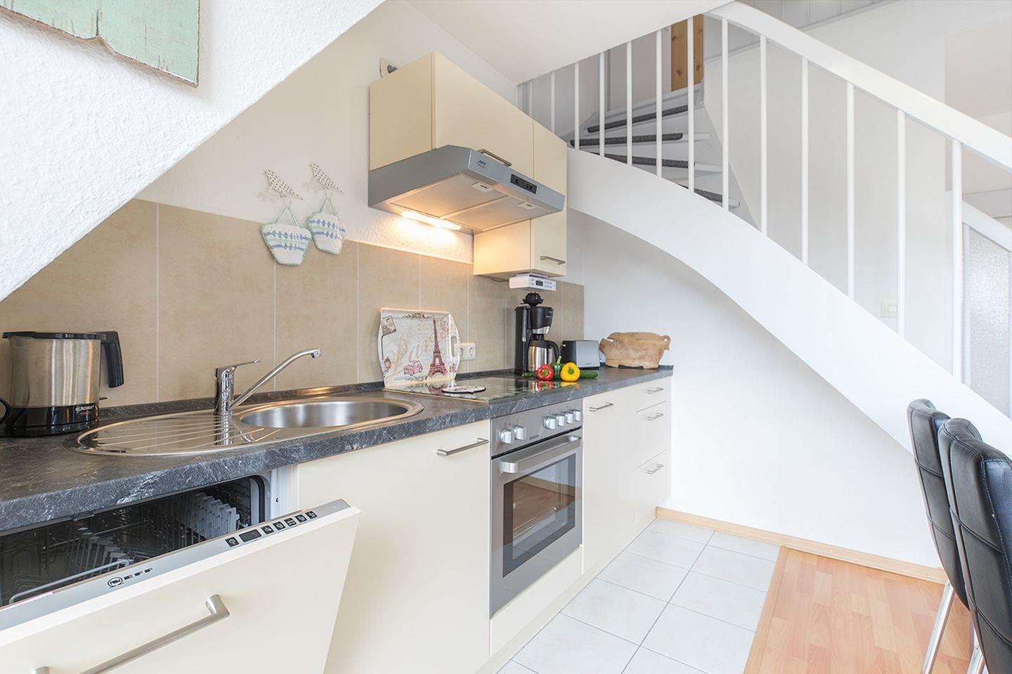 Die zum Wohnbereich offene Küche verfügt über einen Esstisch, Cerankochfeld, Backofen, Spülmaschine, Kühlschrank mit Gefrierfach, Kaffeemaschine und Wasserkocher. Selbstverständlich sind ausreichend Geschirr sowie die üblichen Utensilien einer Küche vorhanden.