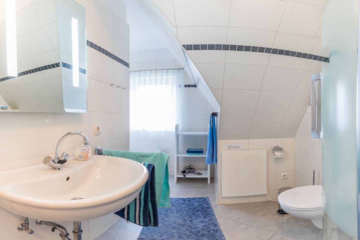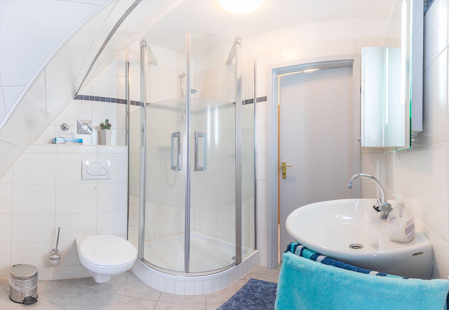 Das Badezimmer befindet sich im unteren Bereich der Wohnung und verfügt über Dusche und WC.