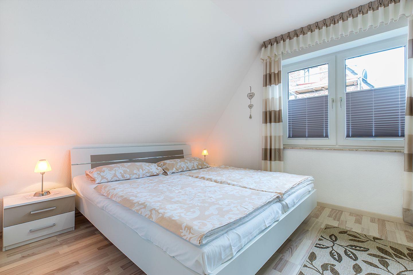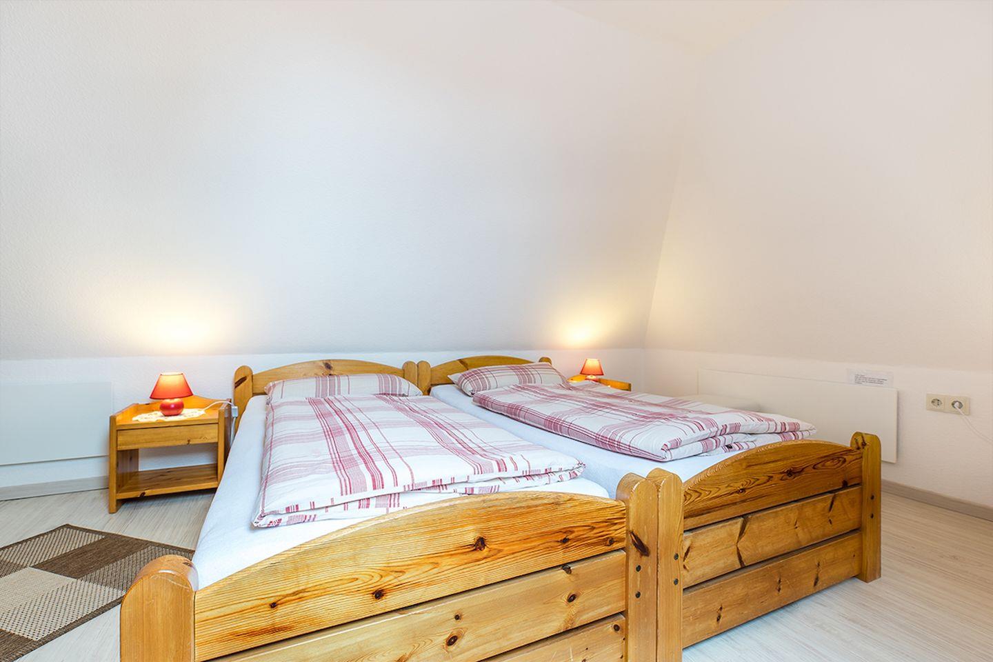 In der unteren Ebene der Ferienwohnung finden Sie ein Schlafzimmer mit einem Doppelbett und einem Kleiderschrank. Im Staffelgeschoss der Wohnung finden Sie ein weiteres Schlafzimmer mit zwei zusammenstellbaren Einzelbetten.