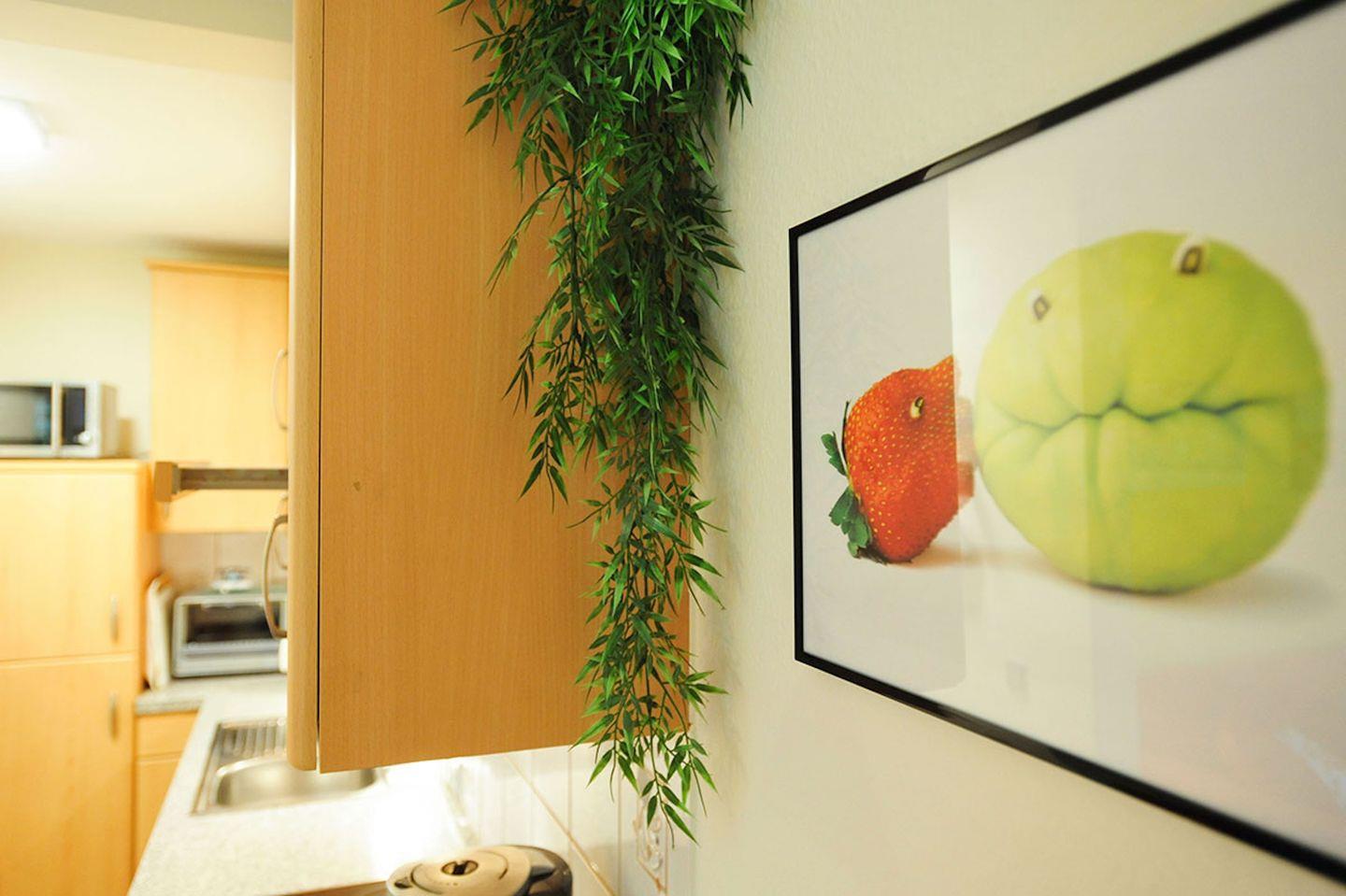 Die offene Küche ist mit 4er Cerankochfeld, Mini-Backofen, Spülmaschine, Mikrowelle, Kühlschrank mit Eisfach, Wasserkocher, Kaffeemaschine, Tassimomaschine ausgestattet. Selbstverständlich sind ausreichend Geschirr sowie die üblichen Utensilien einer Küche vorhanden.