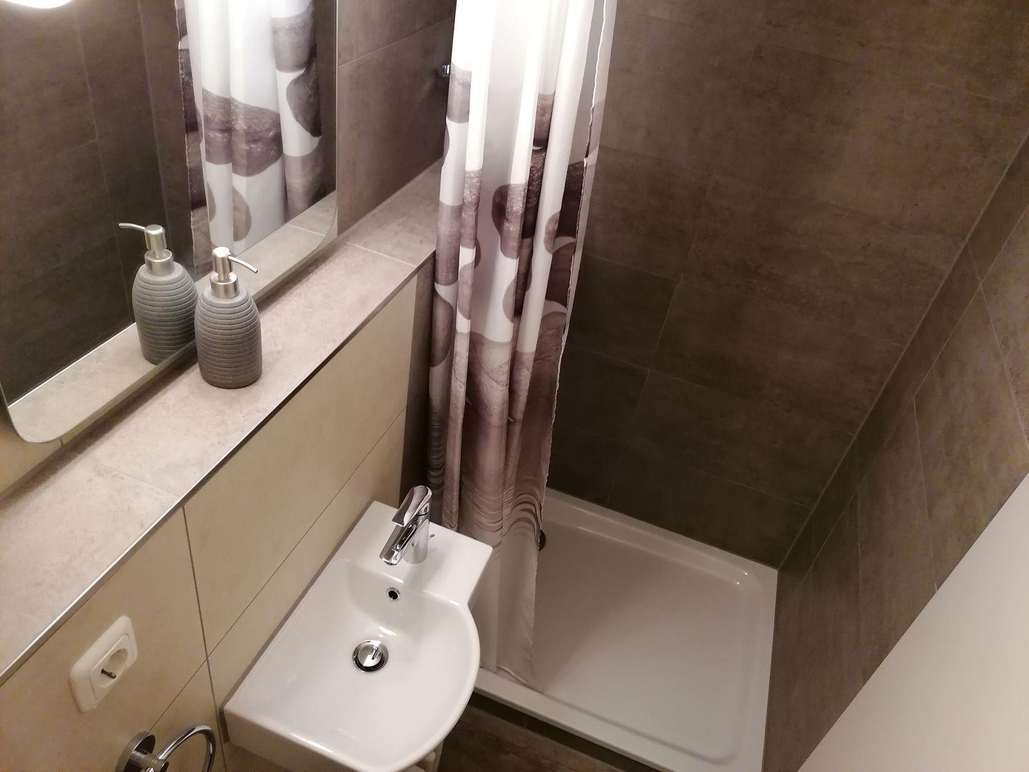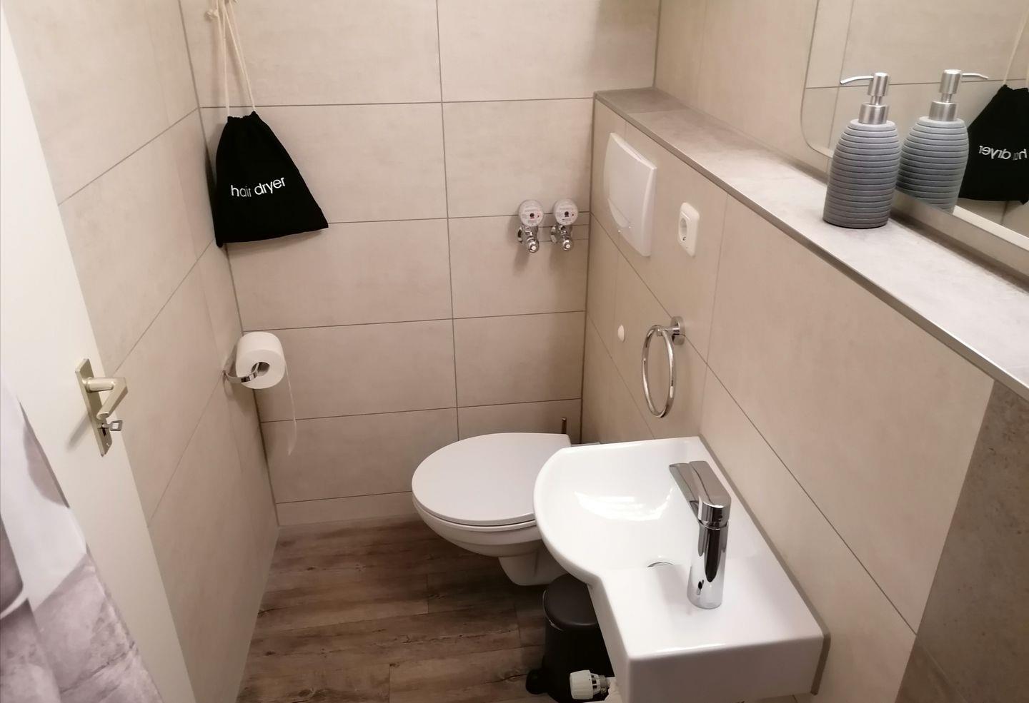 Die Küchenzeile ist sehr gut ausgestattet und verfügt unter anderem über ein Induktionskochfeld, einen kompakten Kühlschrank mit Gefrierfach, sowie Toaster, Wasserkocher, Mikrowelle und Kaffeemaschine. Ein kompakter Geschirrspüler steht ebenfalls zur Verfügung. Das Duschbad der Ferienwohnung ist hell und modern eingerichtet.