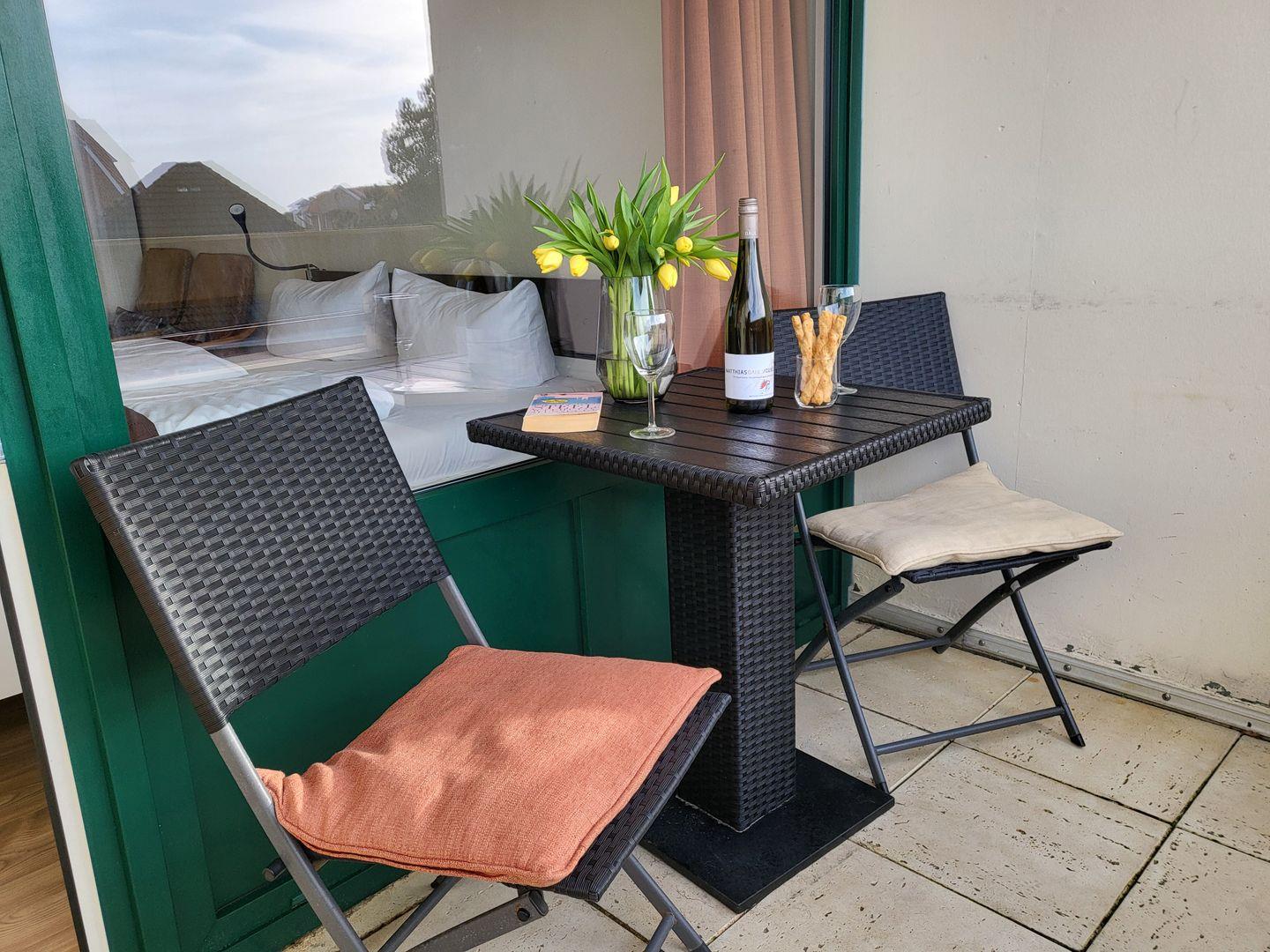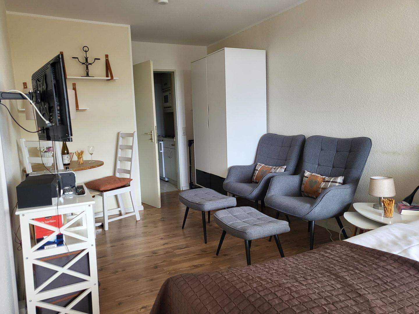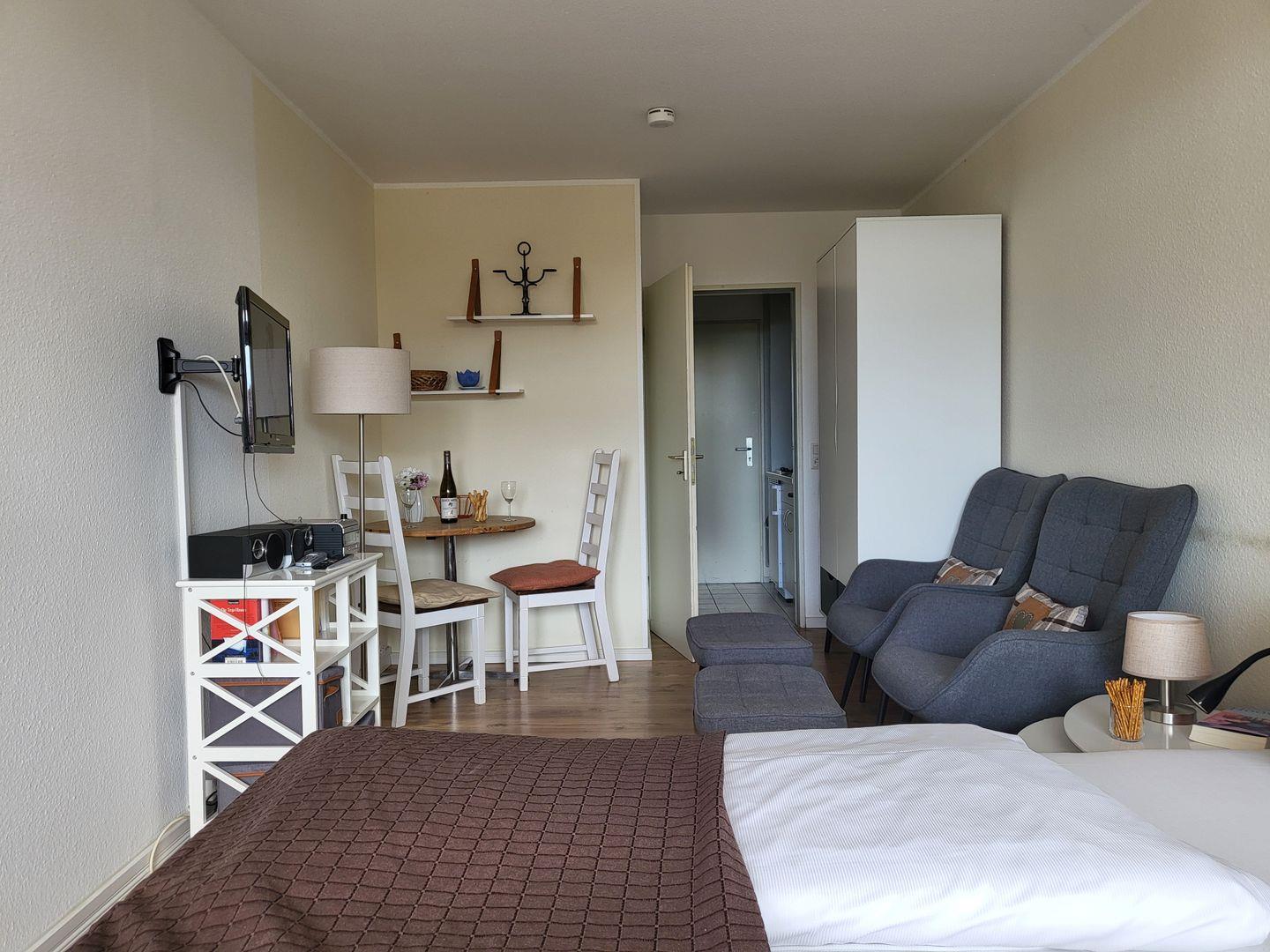 Zentral gelegene 1 Zimmer Ferienwohnung im 2. OG für 2 Personen. Möblierter Balkon mit Blick zur Seeseite. Kombinierter Wohn-Schlafraum mit Doppelbett, 2 Sessel und TV, Esstisch mit Küchenzeile sowie Duschbad mit WC.
