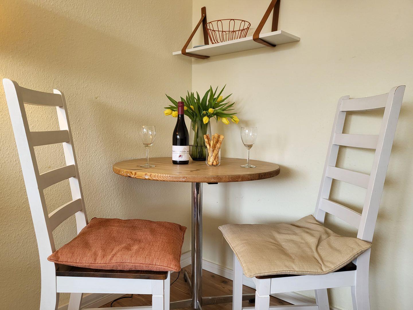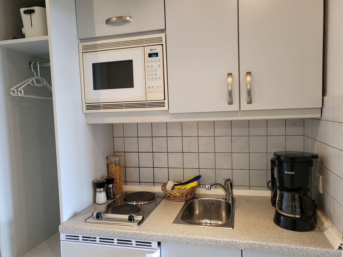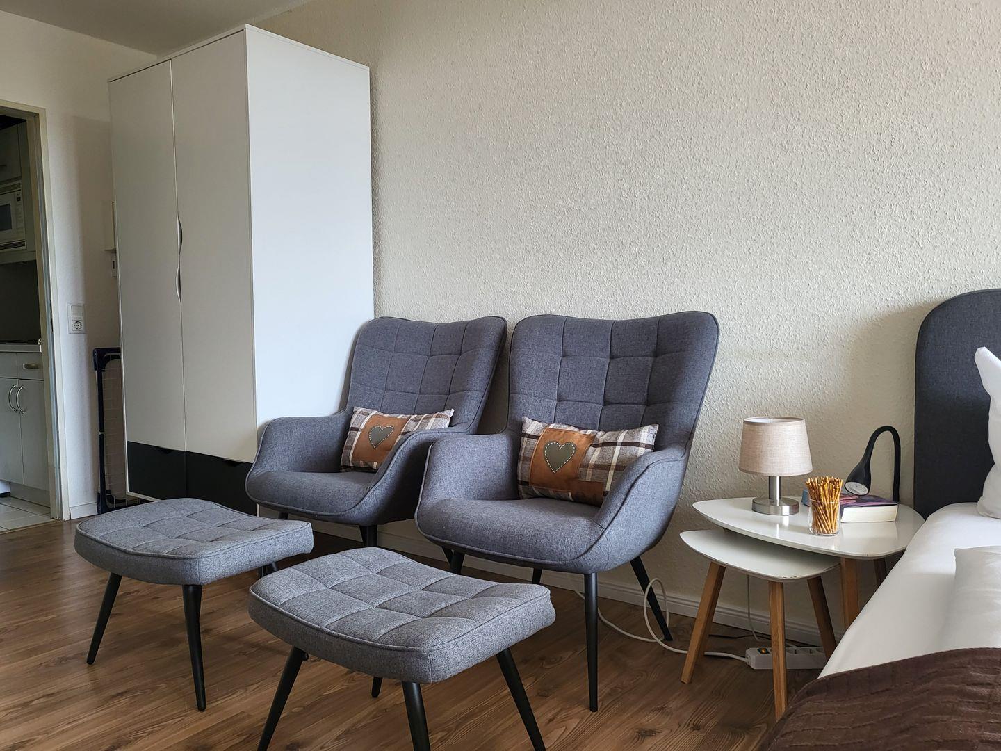 Zentral gelegene 1 Zimmer Ferienwohnung im 2. OG für 2 Personen. Möblierter Balkon mit Blick zur Seeseite. Kombinierter Wohn-Schlafraum mit Doppelbett, 2 Sessel und TV, Esstisch mit Küchenzeile sowie Duschbad mit WC.