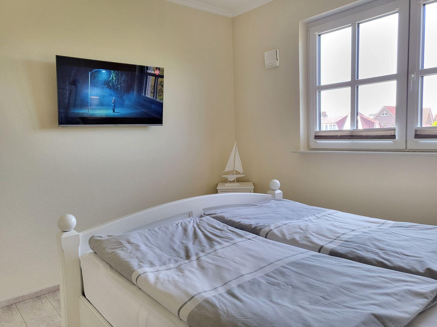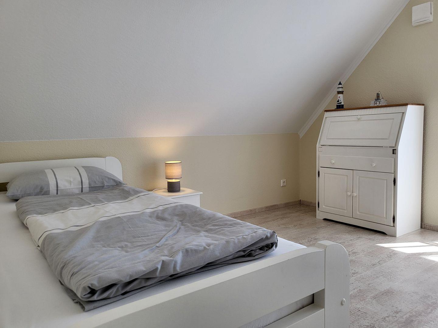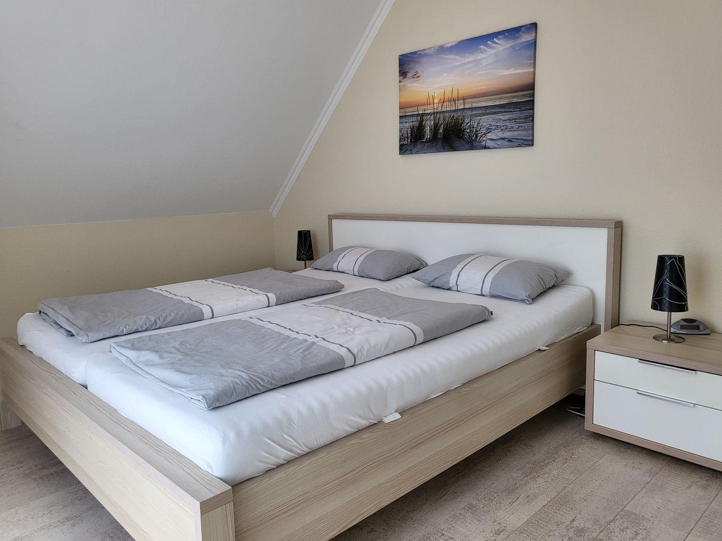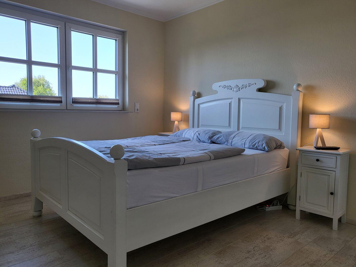Im Obergeschoss stehen drei helle, moderne Schlafzimmer zur Verfügung. Eines ist ausgestattet mit einem großen 180x200cm Doppelbett, im zweiten steht ein 140x200cm Doppelbett mit Flachbild-TV bereit, im dritten Schlafzimmer steht ein Einzelbett zur Verfügung. Alle drei Schlafimmerfenster sind mit Insektenschutzgitern versehen.