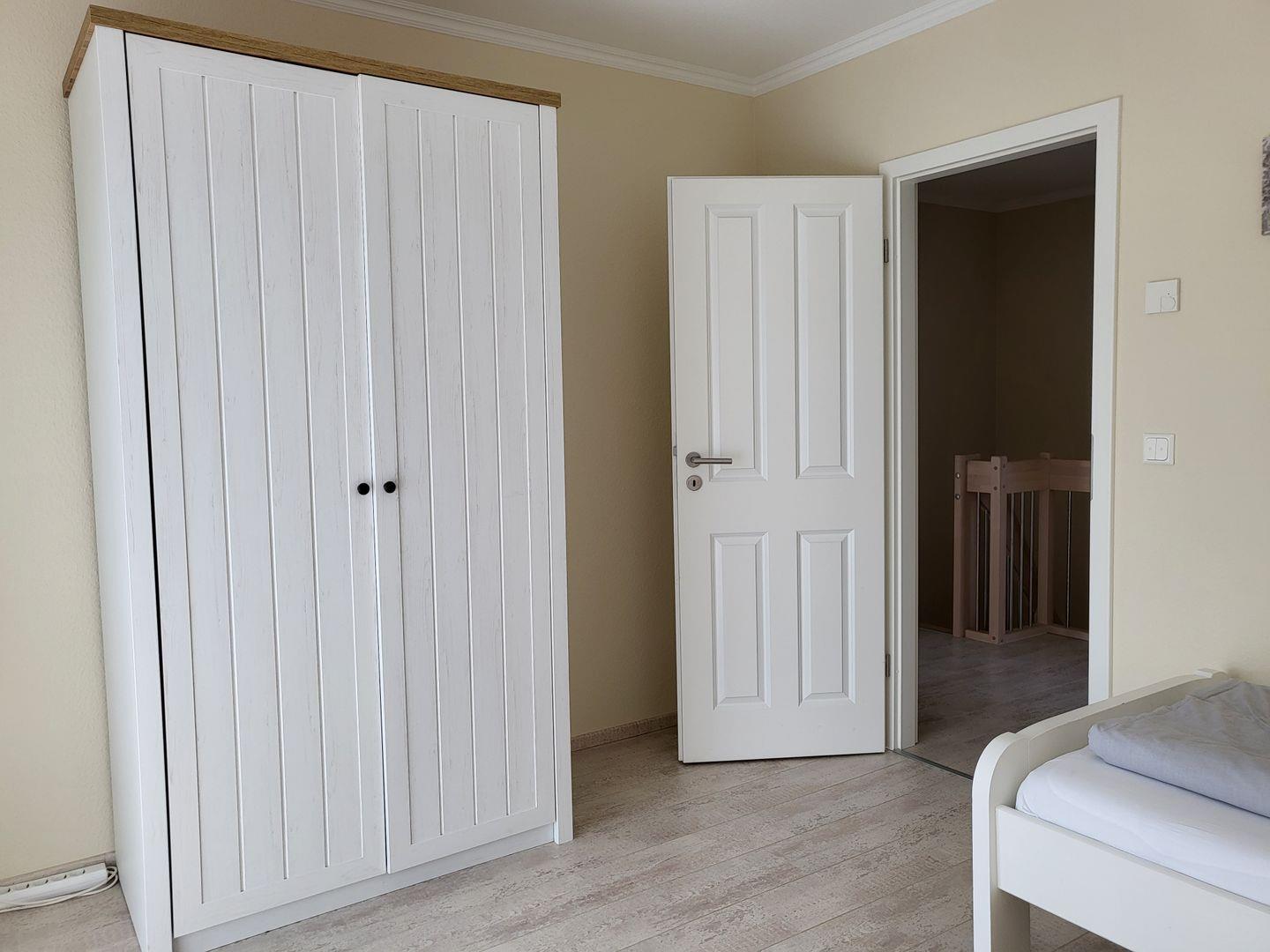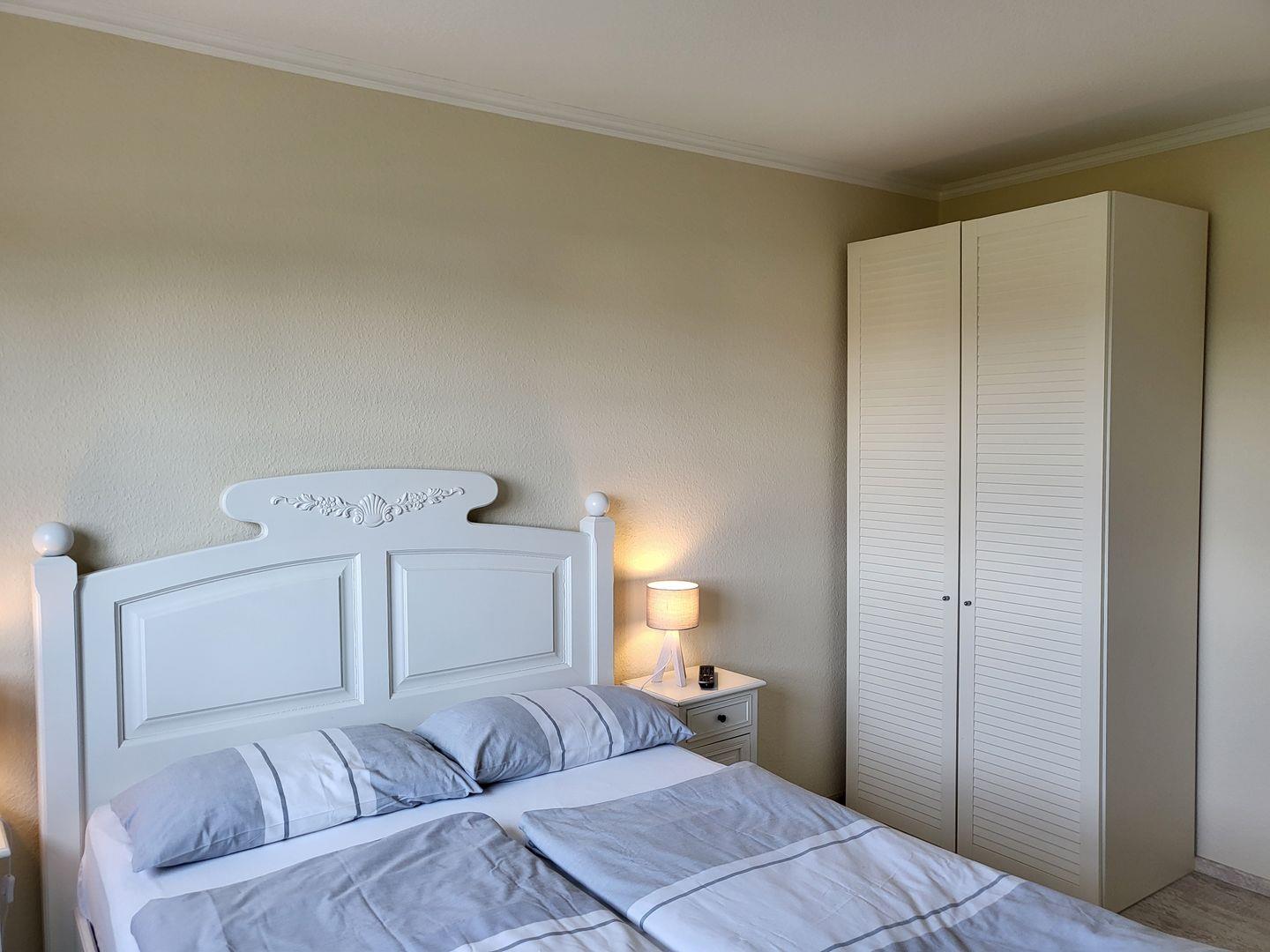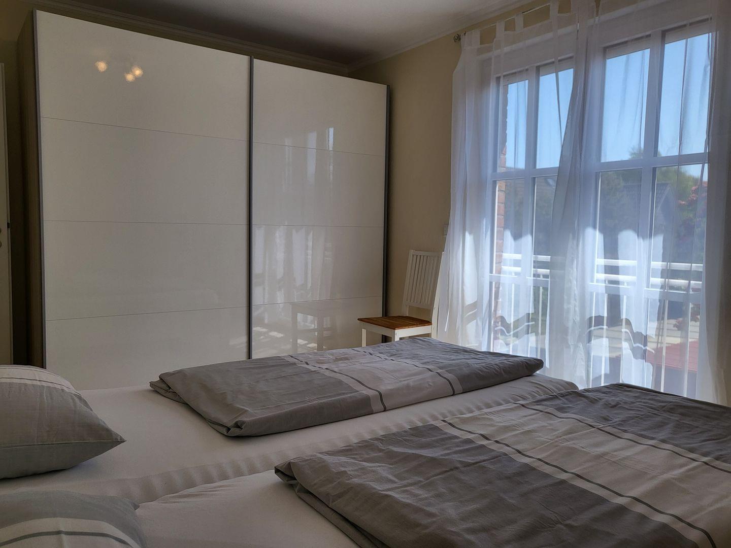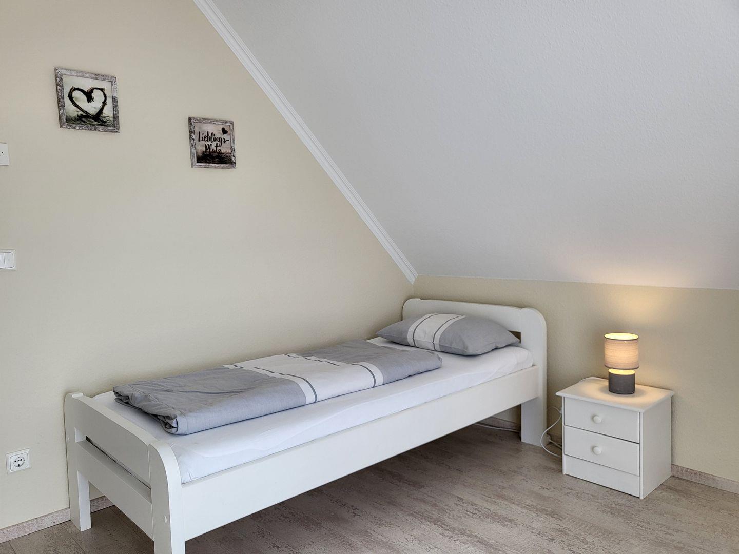 Im Obergeschoss stehen drei helle, moderne Schlafzimmer zur Verfügung. Eines ist ausgestattet mit einem großen 180x200cm Doppelbett, im zweiten steht ein 140x200cm Doppelbett mit Flachbild-TV bereit, im dritten Schlafzimmer steht ein Einzelbett zur Verfügung. Alle drei Schlafimmerfenster sind mit Insektenschutzgitern versehen.