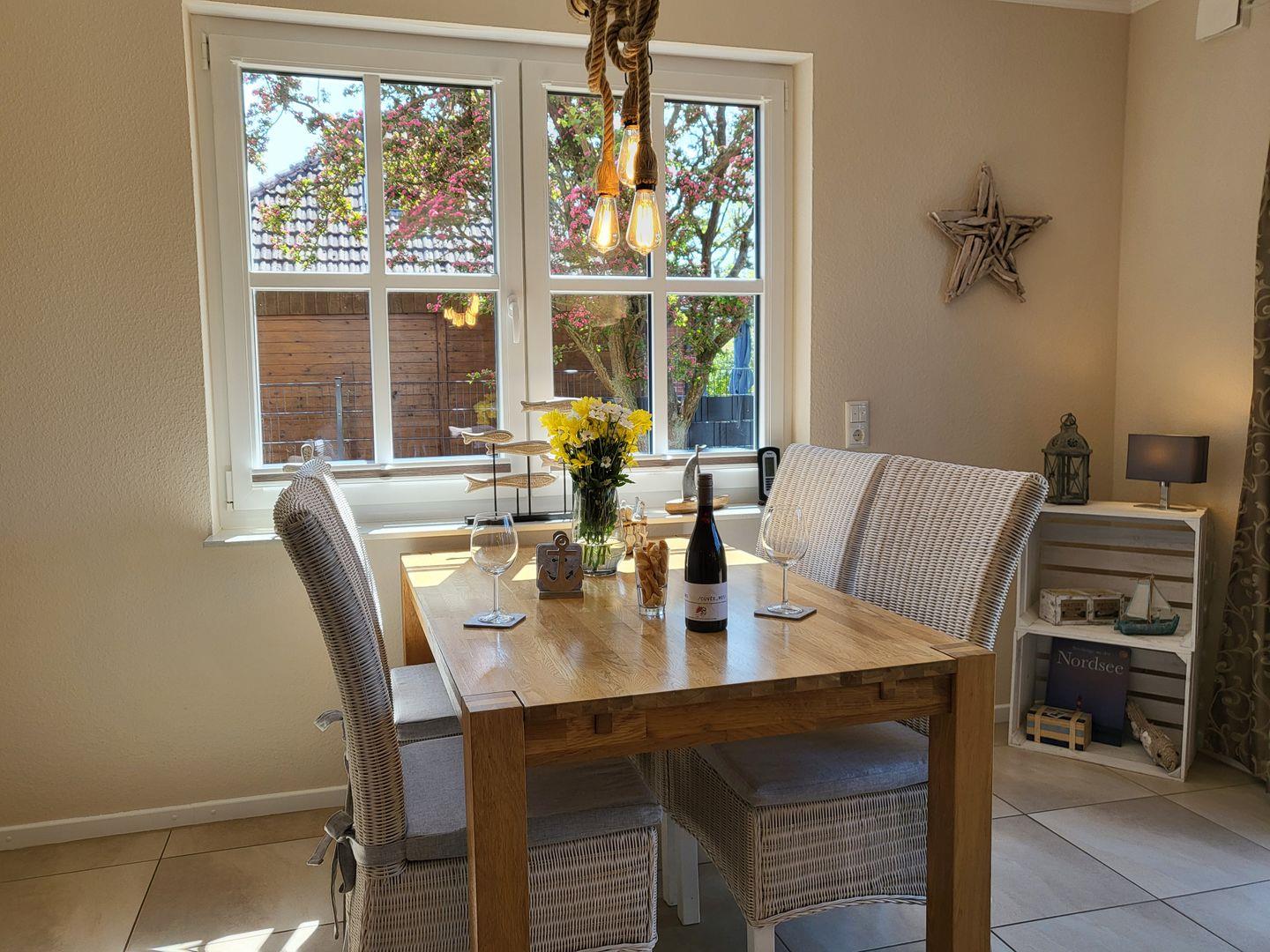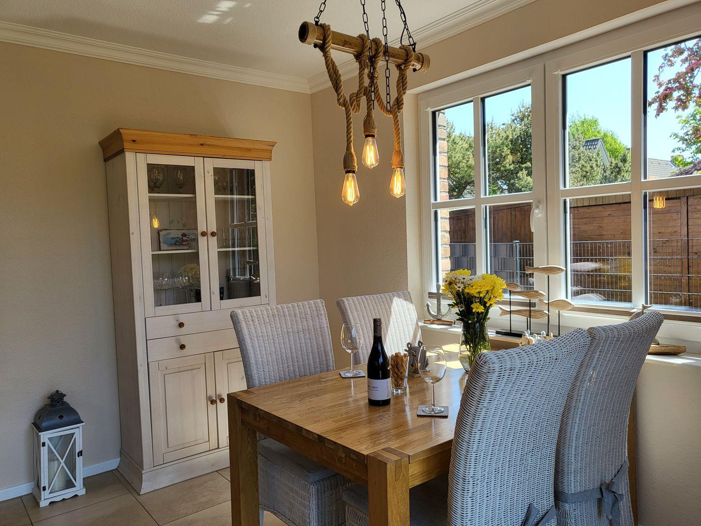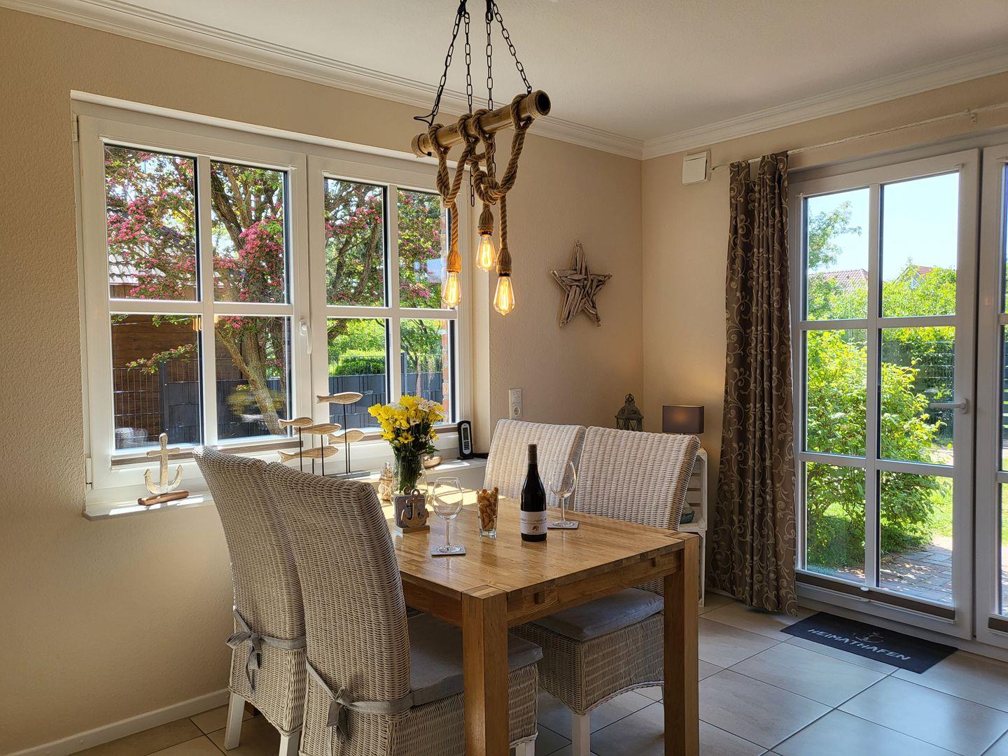 Am Esstisch nimmt die ganze Familie auf edlen Korbstühlen Platz, für die multimediale Unterhaltung sorgen ein großer Flachbild-TV und kostenfreies W-LAN.