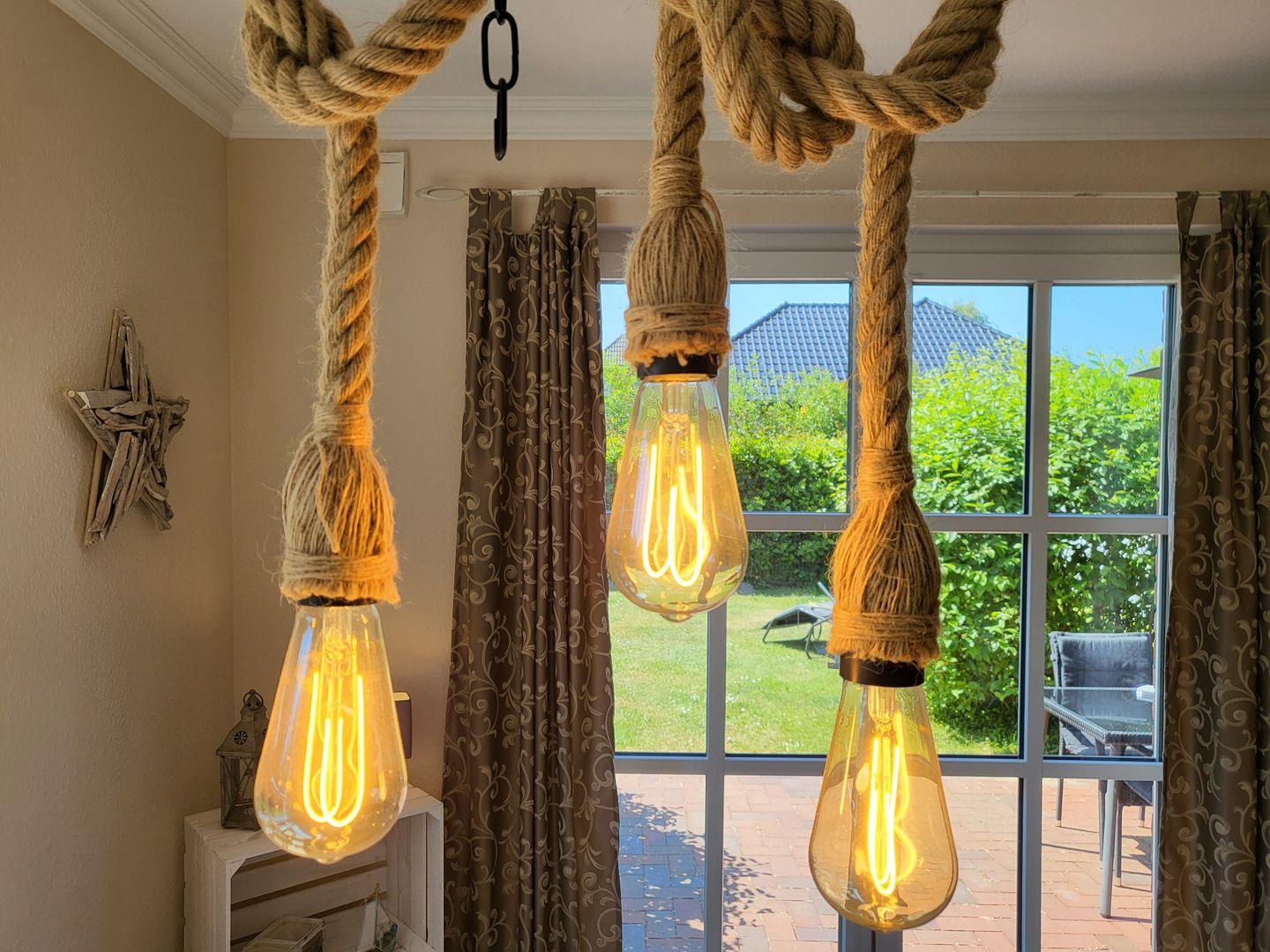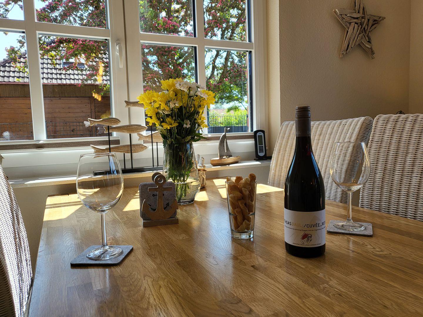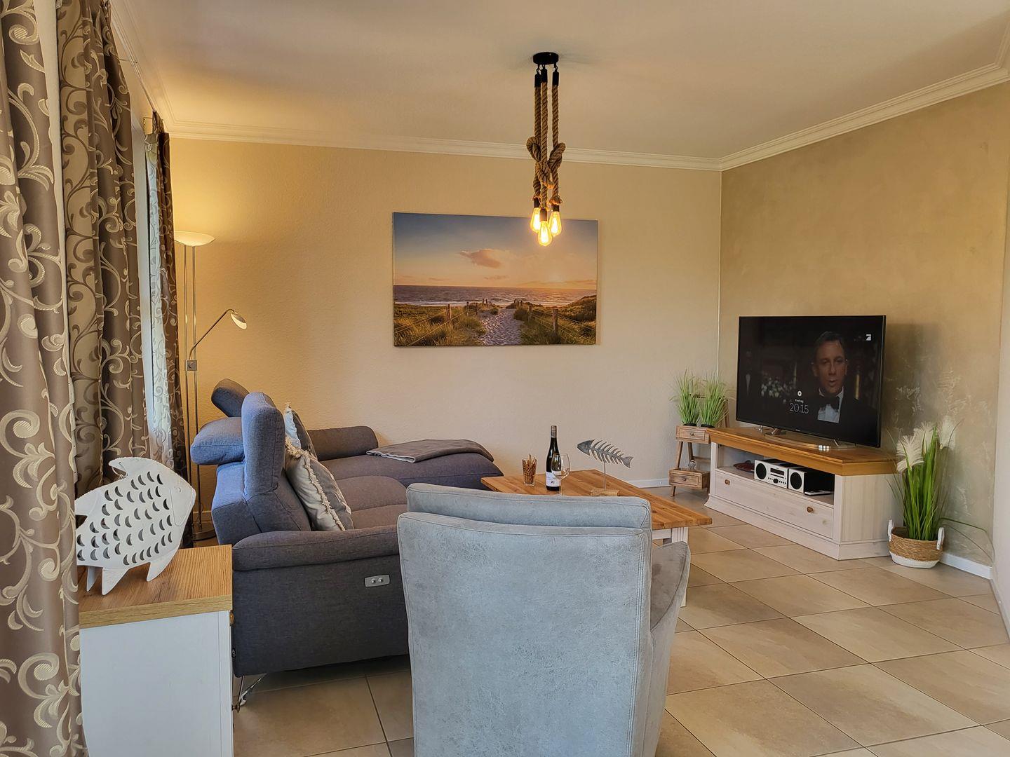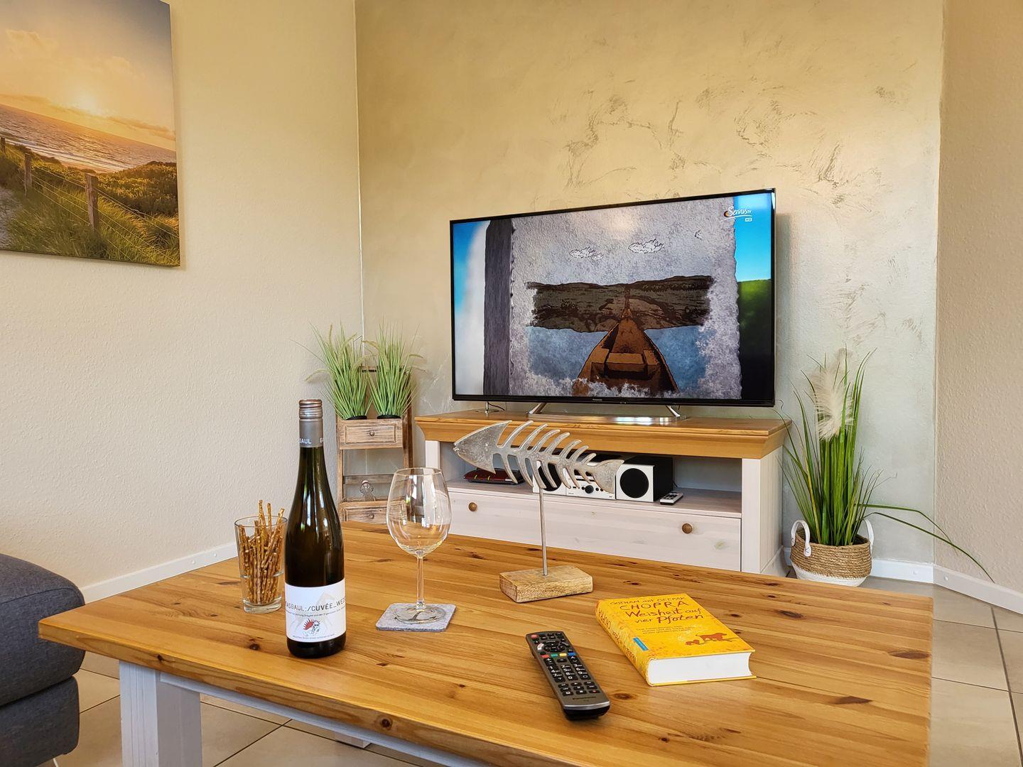 Am Esstisch nimmt die ganze Familie auf edlen Korbstühlen Platz, für die multimediale Unterhaltung sorgen ein großer Flachbild-TV und kostenfreies W-LAN.