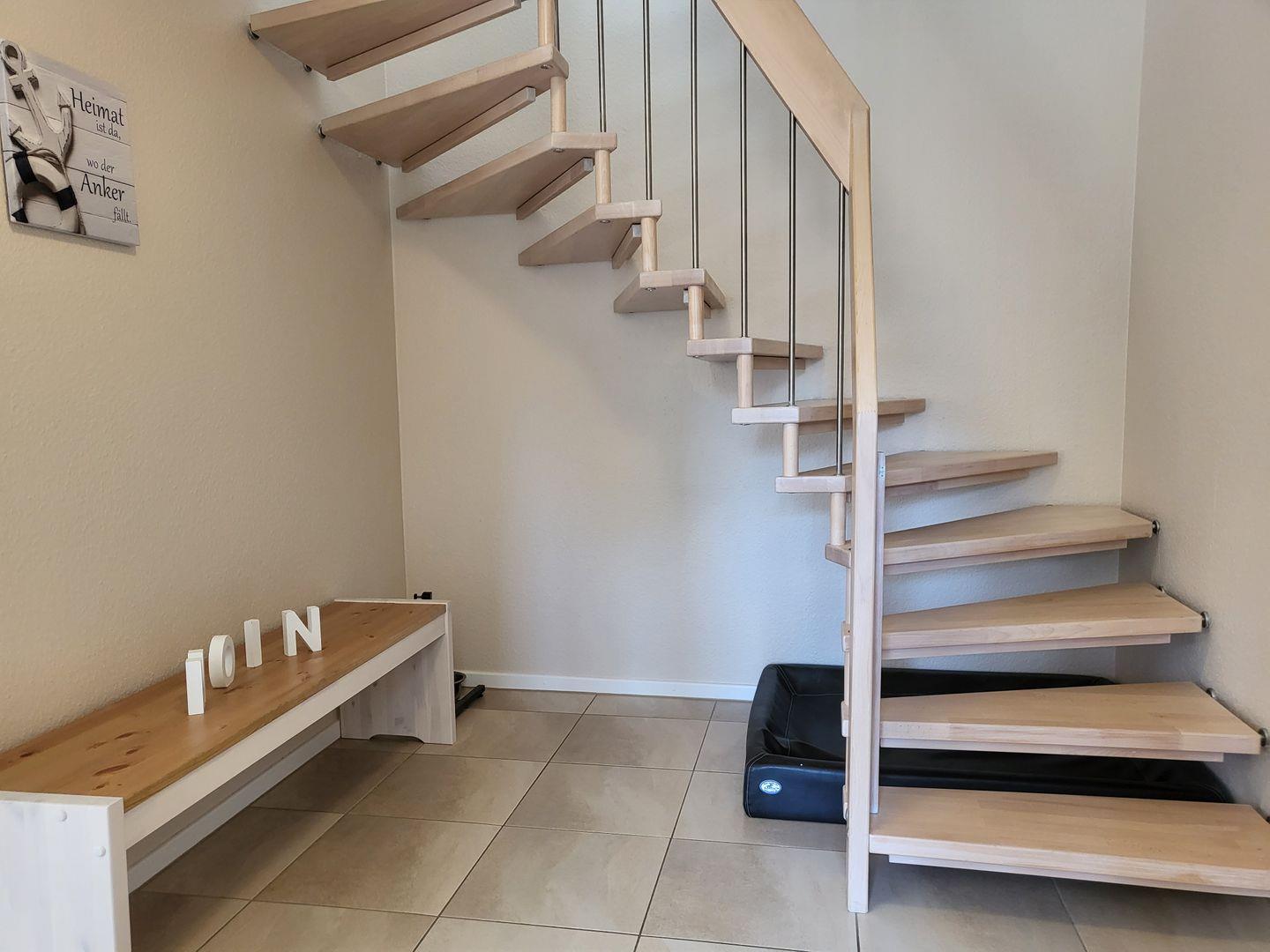 Im Hauswirtschaftsraum steht eine Waschmaschine zur Verfügung, zum Erdgeschoss gehört ebenfalls ein Gäste-WC. Der Aufgang ist mit einem Hundeschutzgitter versehen. Als Besonderheiten sind auch höhenverstellbare Hunde-Bar und ein wertiges Hundebett vorhanden.