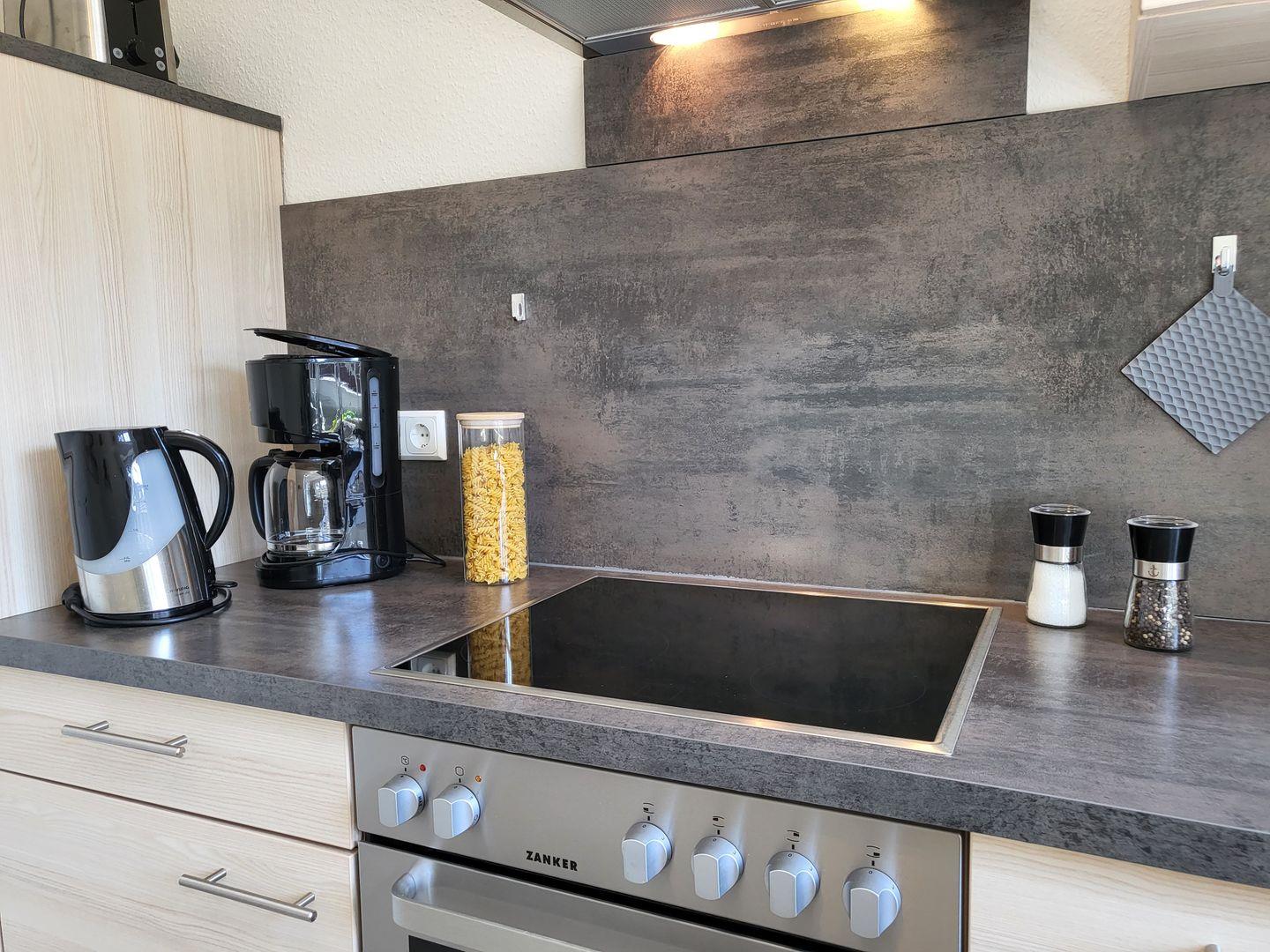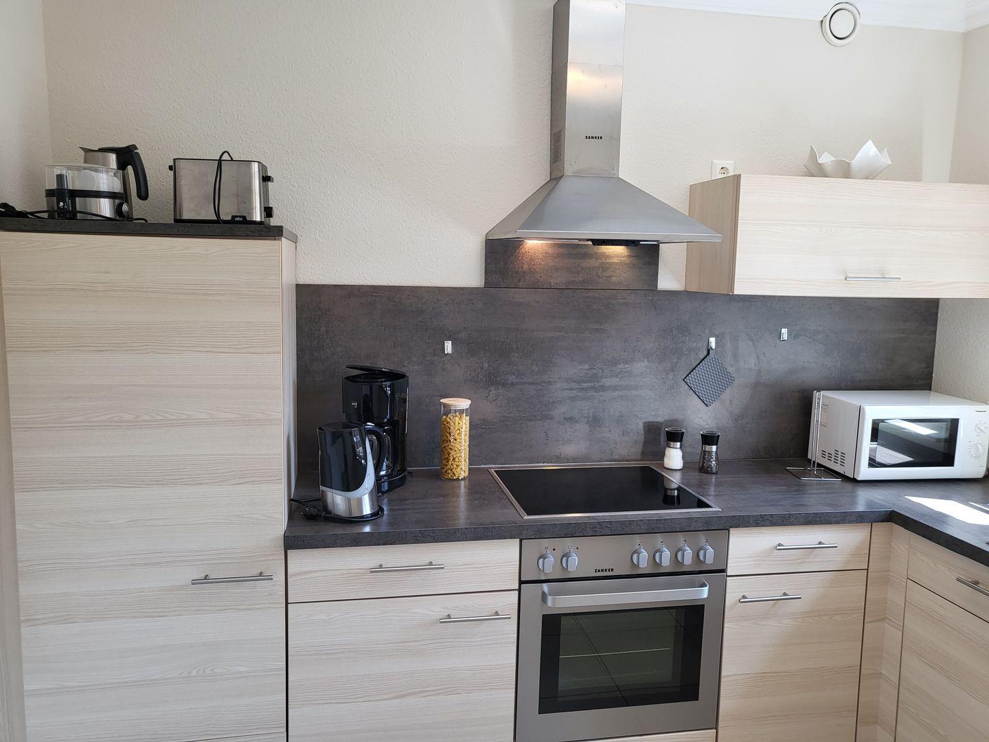 Die separat gelegene Küche ist modern und hochwertig ausgestattet. Hier gehören unter anderem ein großes Cerankochfeld mit Backofen, ein Kühlschrank mit Gefrierfach sowie Geschirrspüler, eine edler De Longi Kaffeeautomat und ein Ninja-Airfryer zum Inventar.
