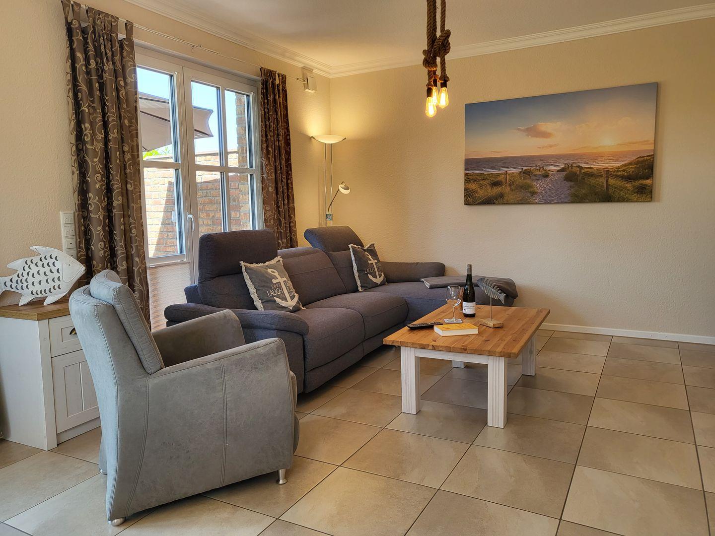 Durch den Übergang zur möblierten Terrasse und die große Fensterfront wirkt das maritim eingerichtete Wohnzimmer wunderbar hell und einladend.