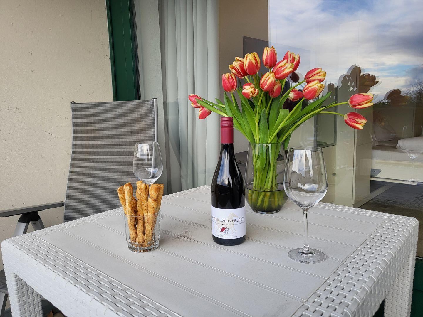 Der große Wohn- und Schlafraum ist modern und hochwertig eingerichtet. Er ist ausgestattet mit einer sehr gemütlichen Ledercouch und einem Flachbild-TV sowie einer kompakten Ess-Ecke. Das komfortable, platzsparende Schrankbett fügt sich perfekt ins Raumbild ein. Durch den Durchgang zu zwei möblierten Balkonen, einer davon mit Blick zur Seeseite und die Panoramafenster wirkt der Raum wunderbar hell. Kostenfreies W-LAN steht zur Verfügung.