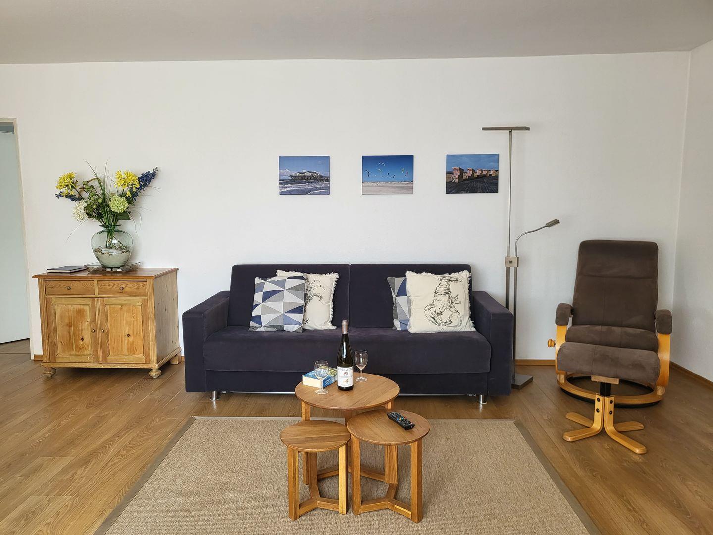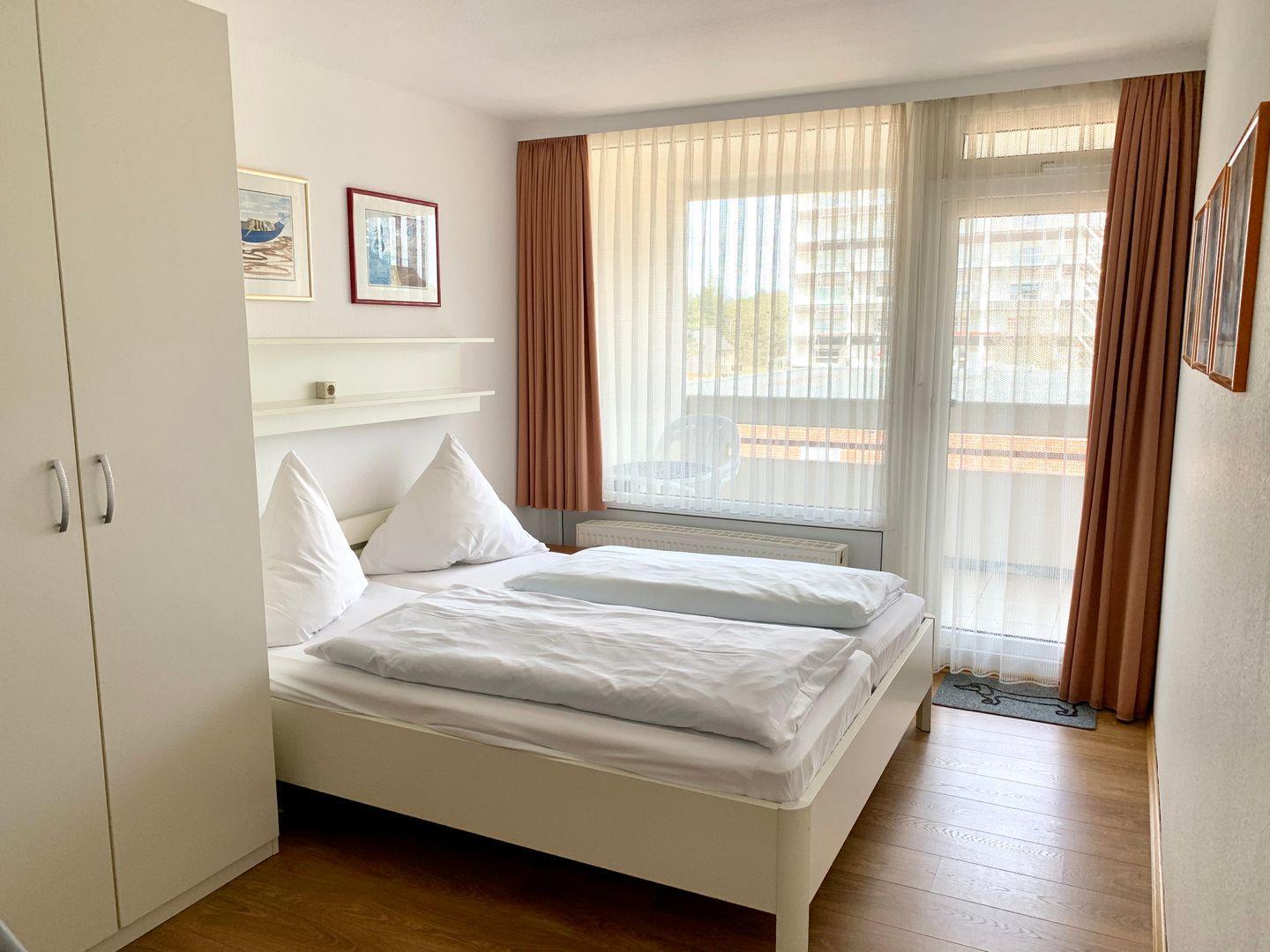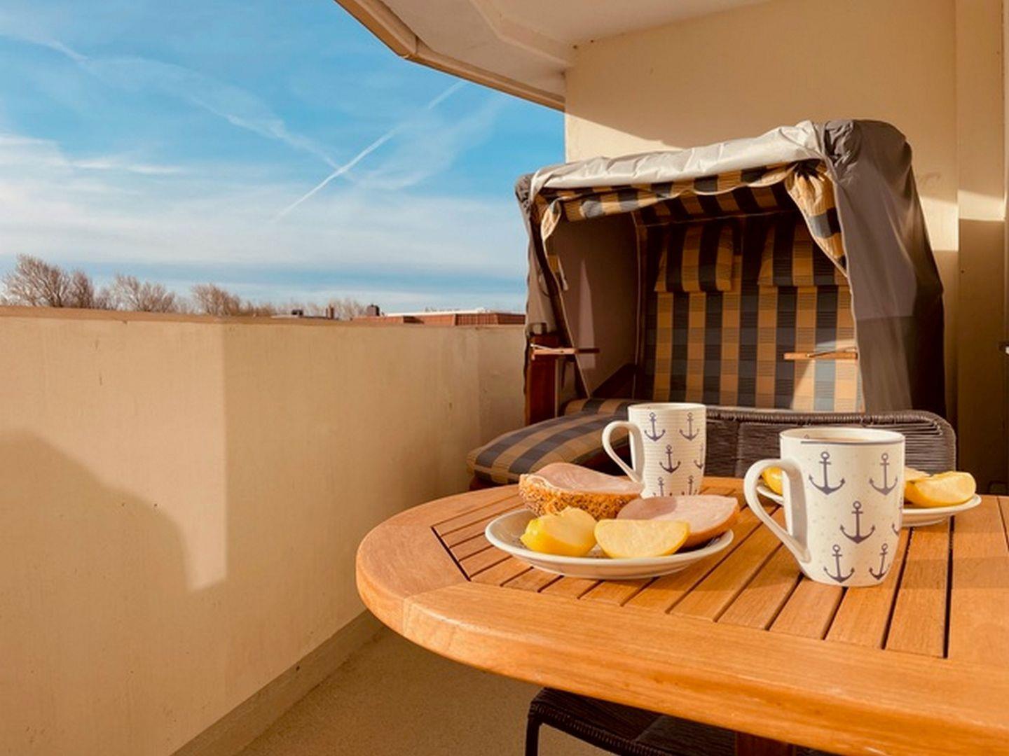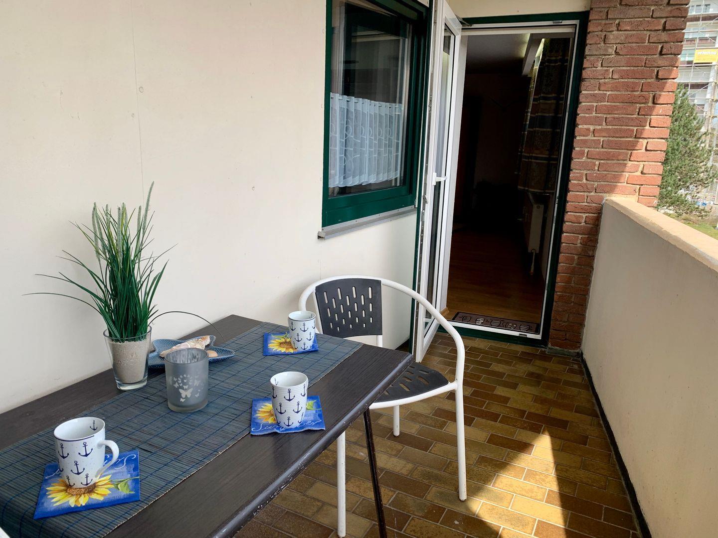 Zentrale 3 Zimmer Ferienwohnung im 2. OG mit Balkon und Strandkorb für bis zu 6 Personen. Ausgestatet mit Wohnraum mit Ess- und Sitzbereich,