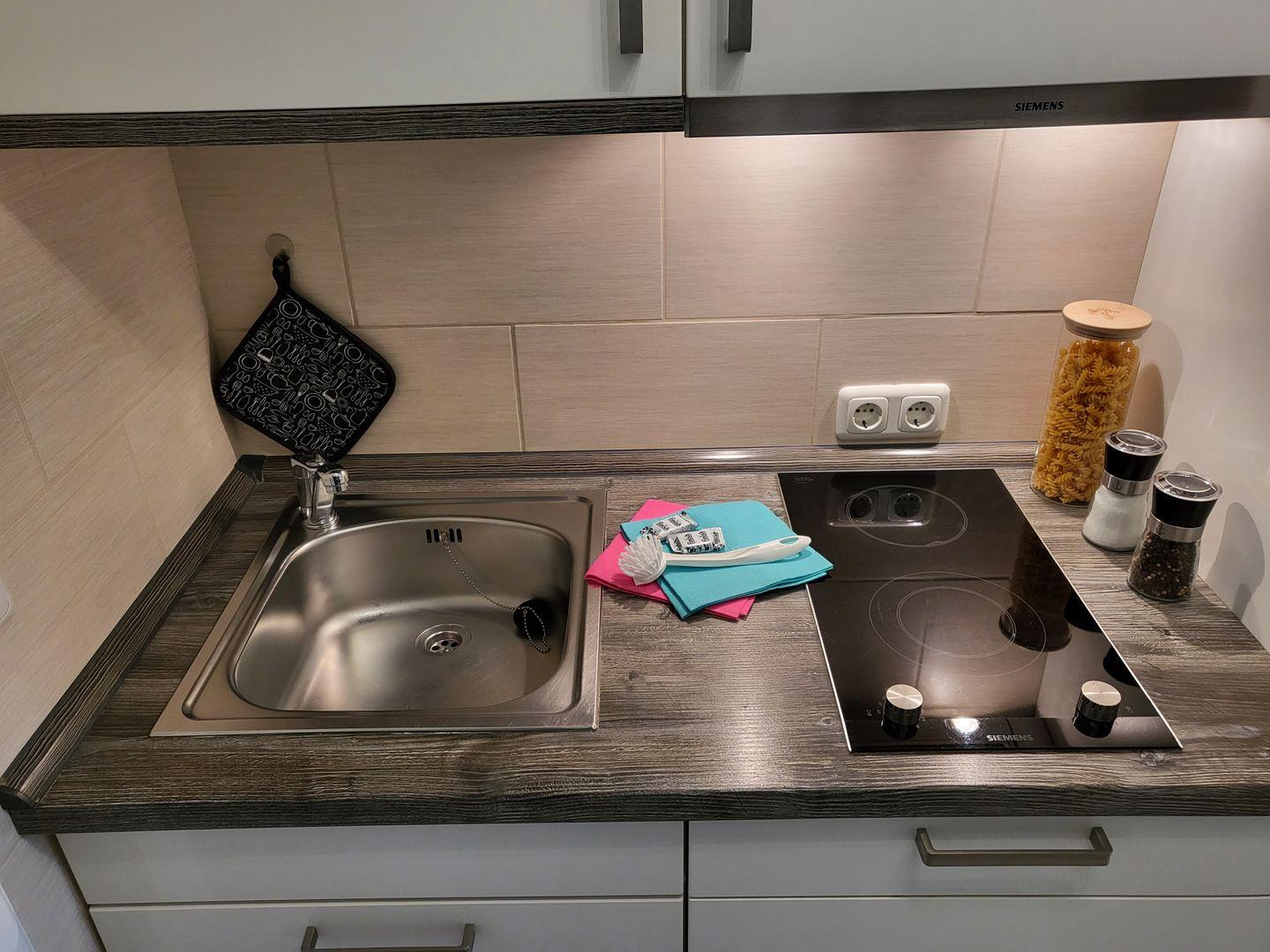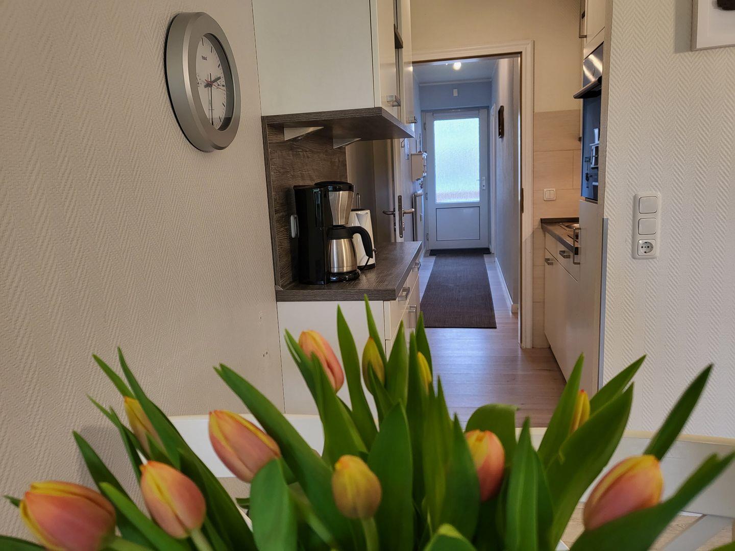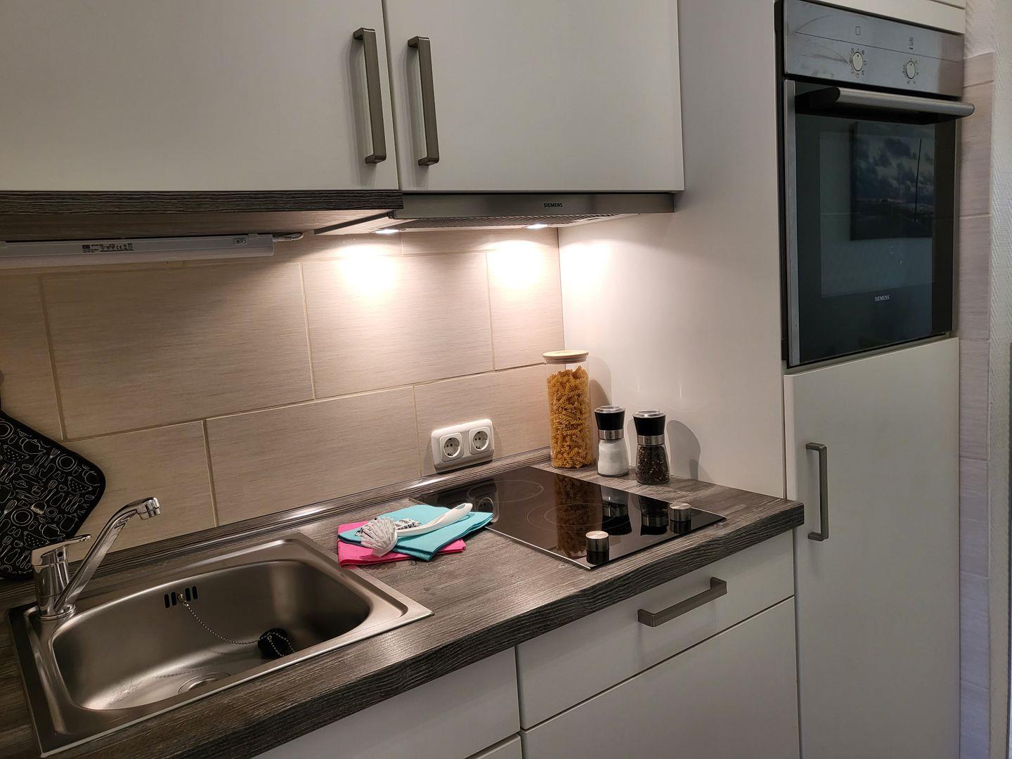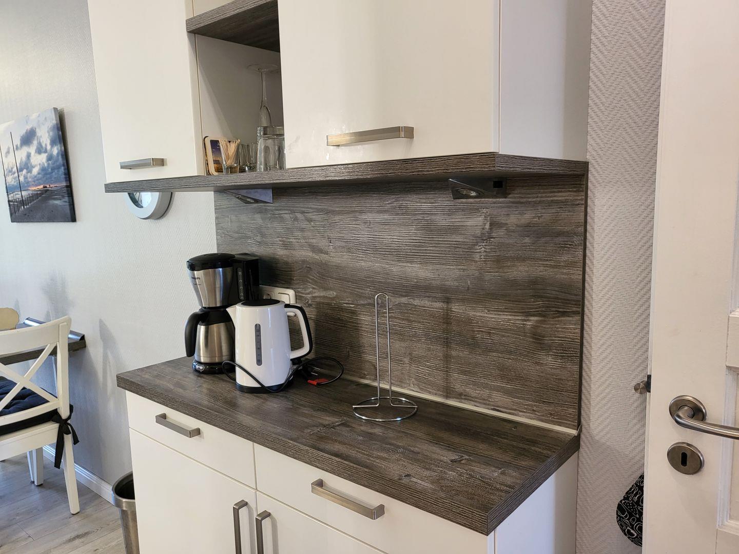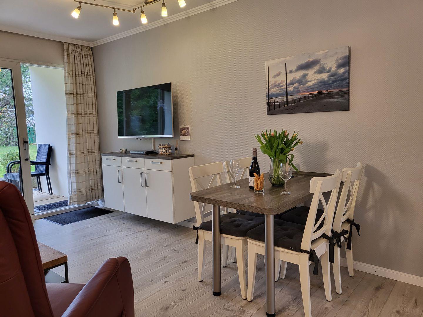 Eine gemütliche Ess-Ecke grenzt an die offene Küchenzeile an, die sehr gut ausgestattet ist. Hier stehen unter anderem Carankochfeld, Kühlschrank mit Gefrierfach sowie Kaffeemaschine und Geschirrspüler zur Verfügung.