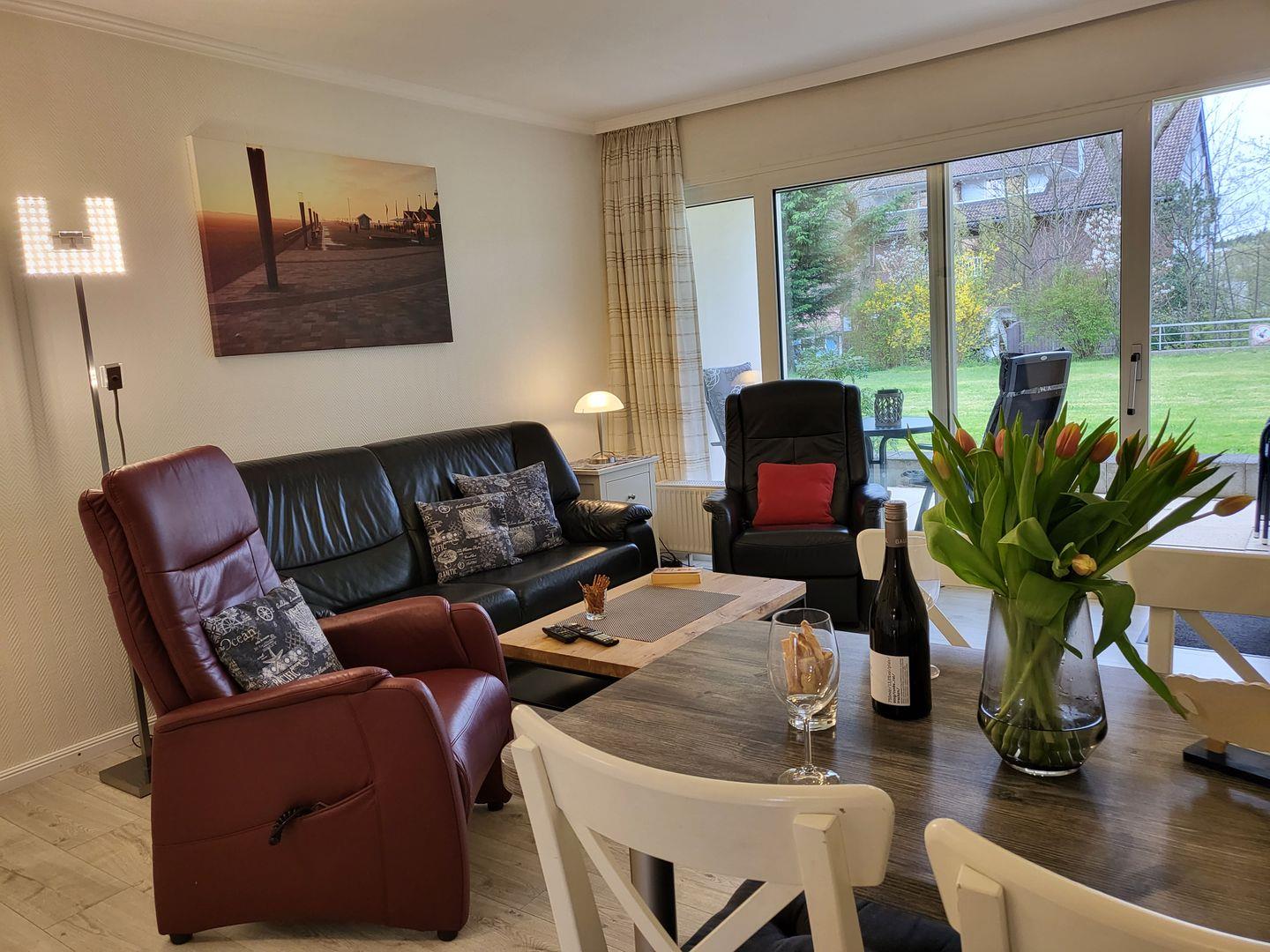 Zentrale 2-Zimmer Wohnung für bis zu 4 Personen mit möblierter West-Terrasse. Wohnraum mit Schrankbett, Essecke und Ledercouch, offene Küche.
