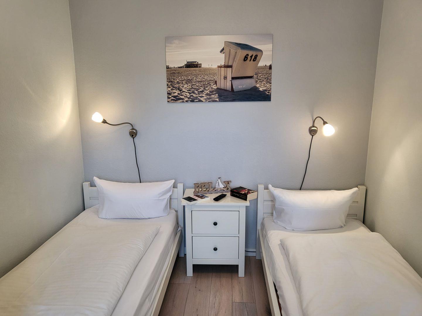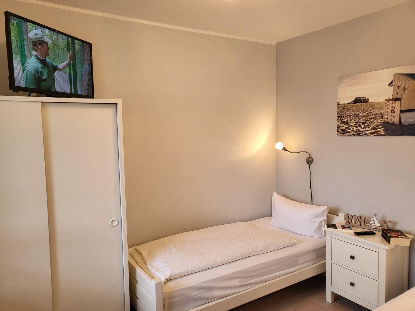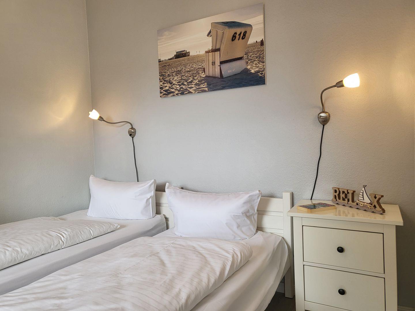 Ein separates Schlafzimmer mit zwei Einzelbetten und großem Kleiderschrank ist vorhanden. Die Ferienwohnung verfügt über ein Duschbad und WC.