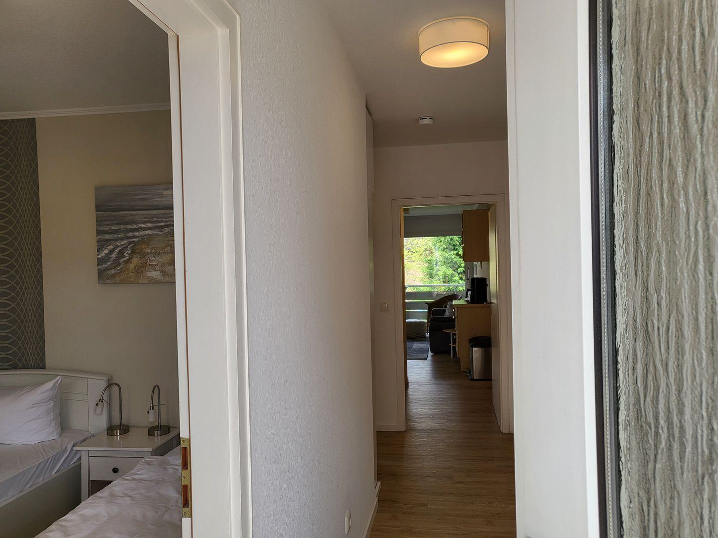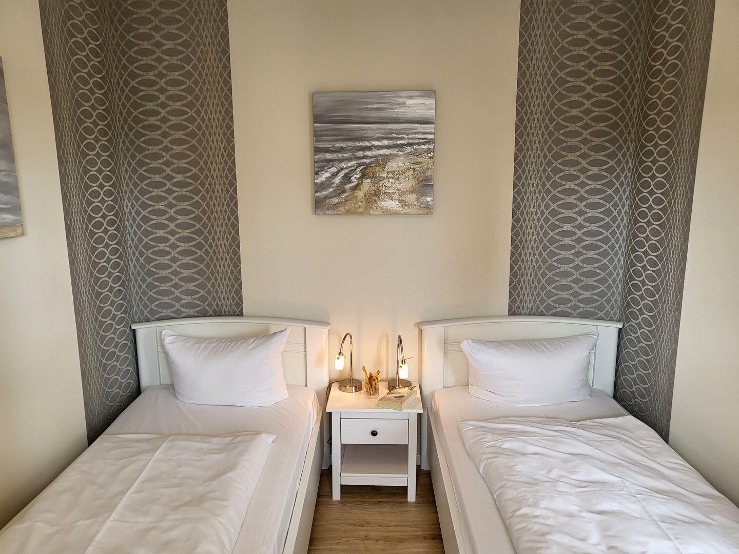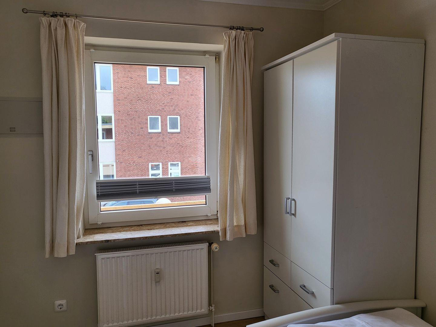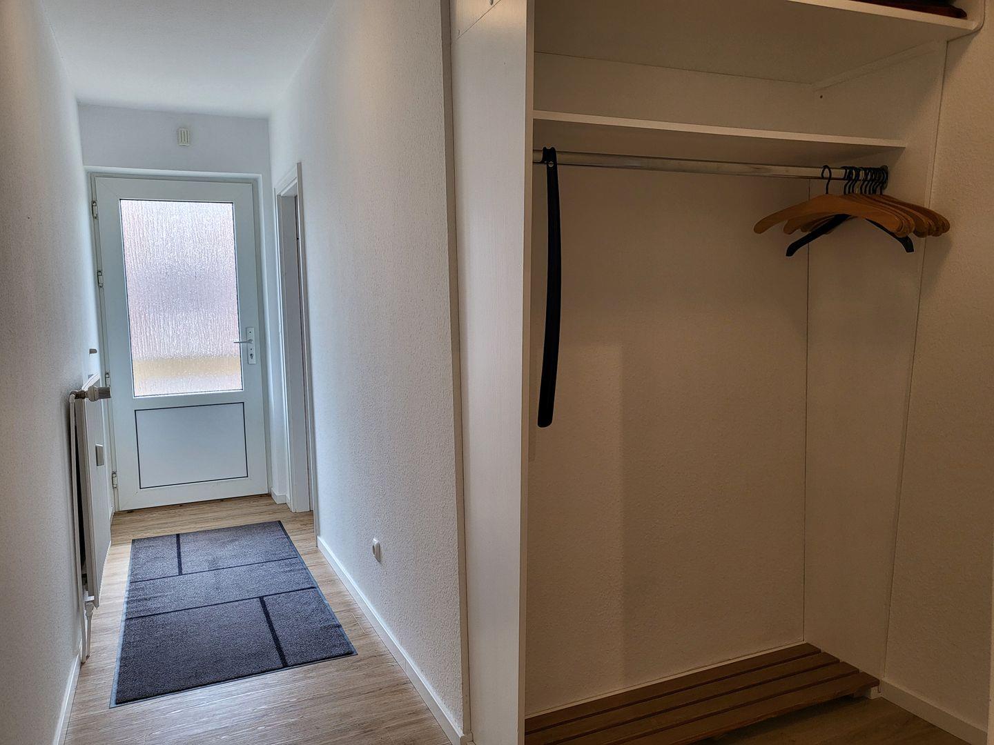 Zentrale 2 Zimmer-Wohnung für bis zu 4 Personen im 1. OG mit möbliertem Balkon. 1 Schlafzimmer mit 2 Einzelbetten, Flur mit