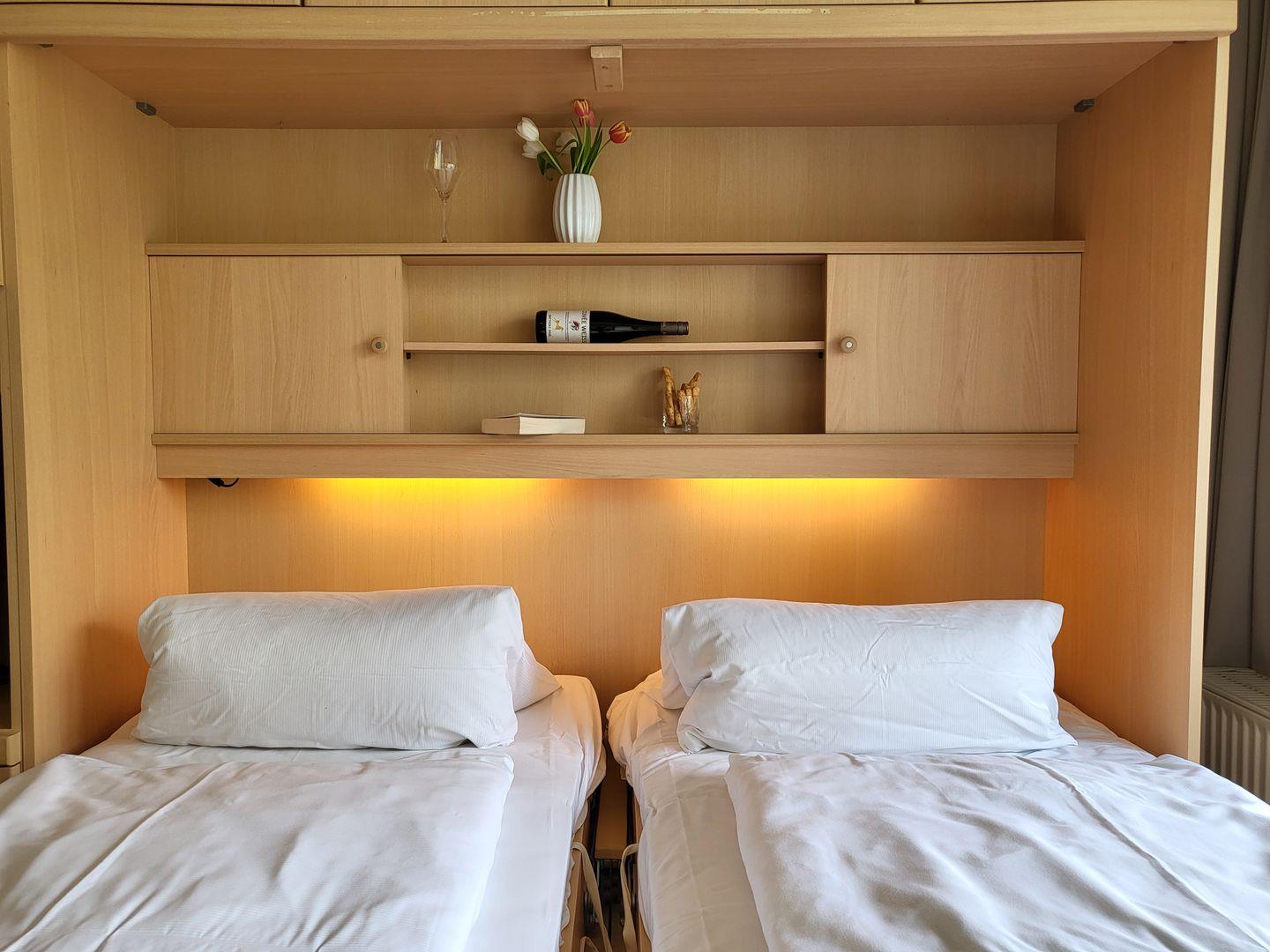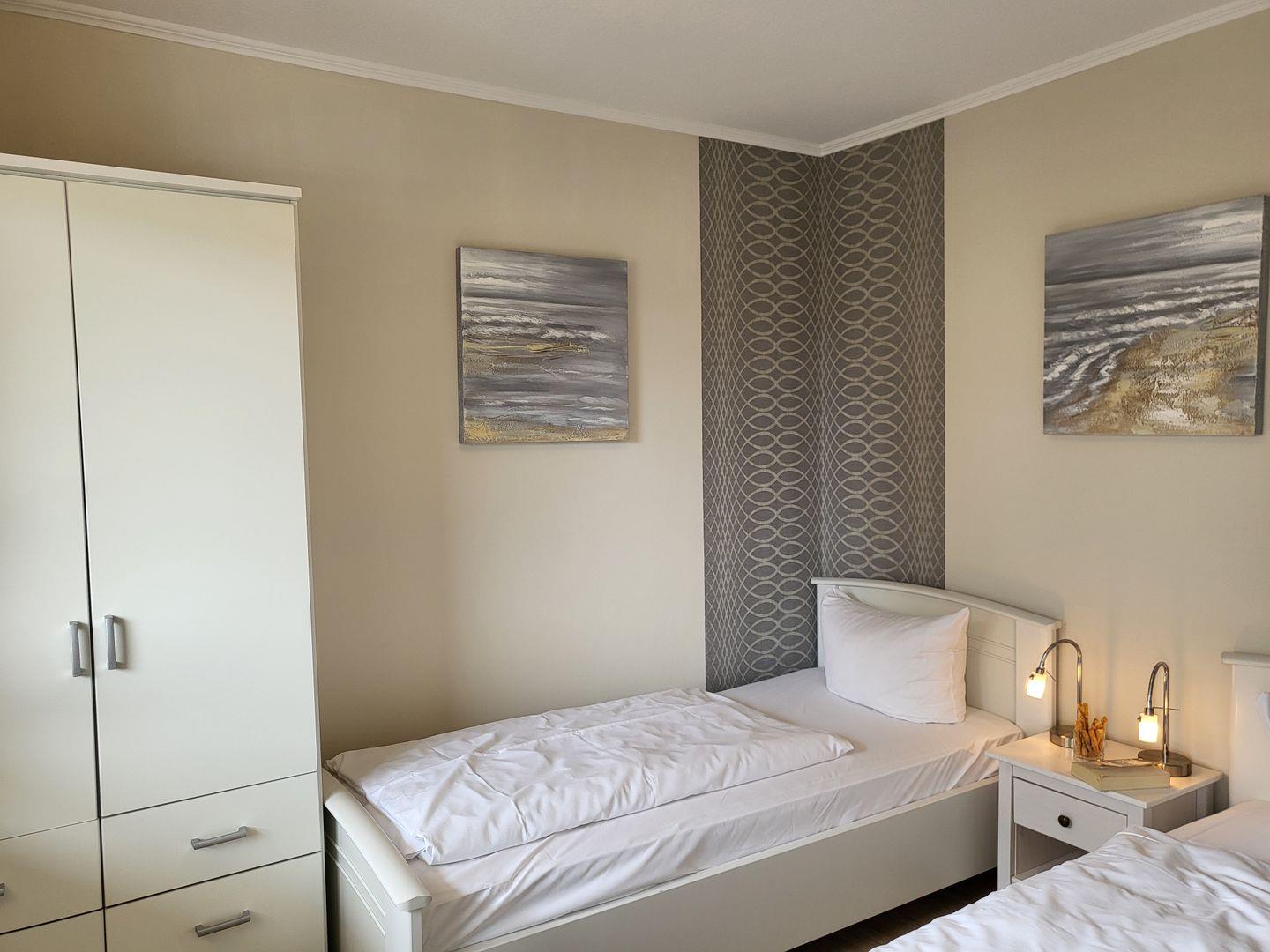 Ein separates Schlafzimmer mit zwei Einzelbetten und Kleiderschrank ist vorhanden.