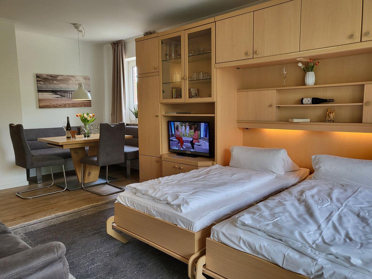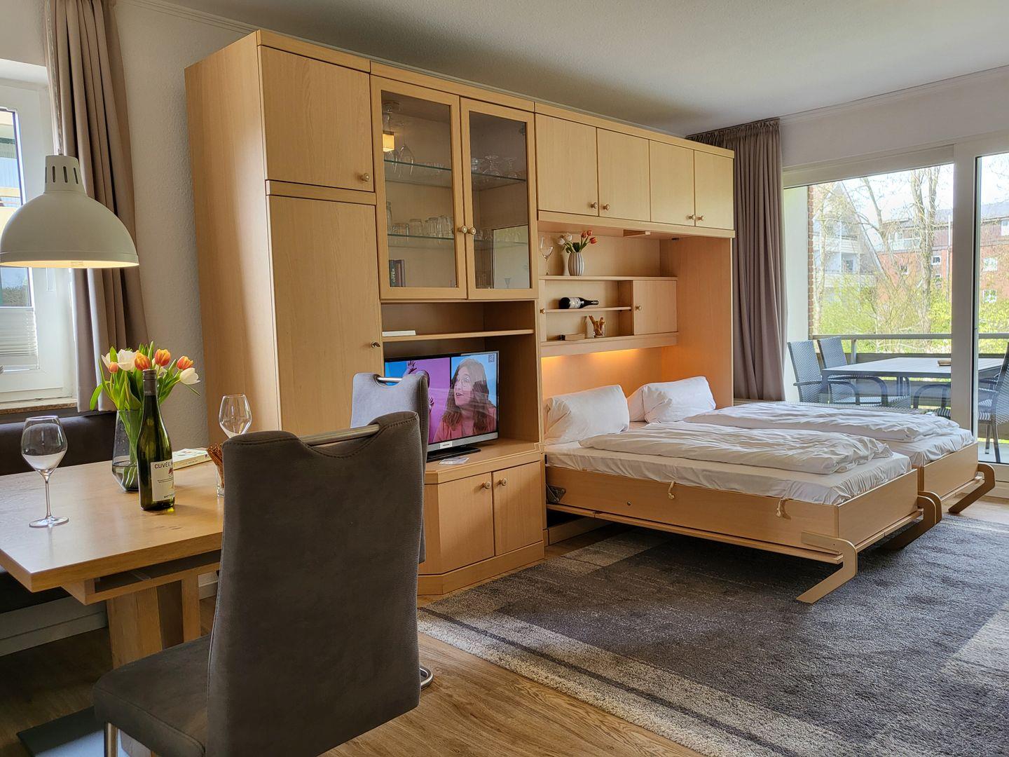Der große kombinierte Wohn- und Schlafraum ist ausgestattet mit einem komfortablen Schrankbett. Zur Ausstattung gehören hier mehrere komfortable Sitzgelegenheiten mit bestem Blick in Richtung Flachbild-TV. Kostenfreies W-LAN ist vorhanden.