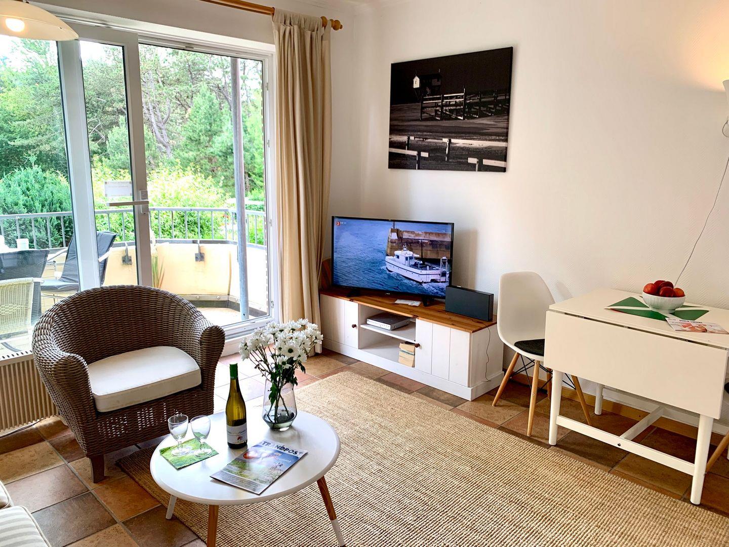Hier sorgen eine gemütliche Couch und ein komfortabler Sessel für gemütliche Stunden. Ein großer Flachbild-TV mit DVD-Player sorgt für Unterhaltung. WLAN ist nicht vorhanden.