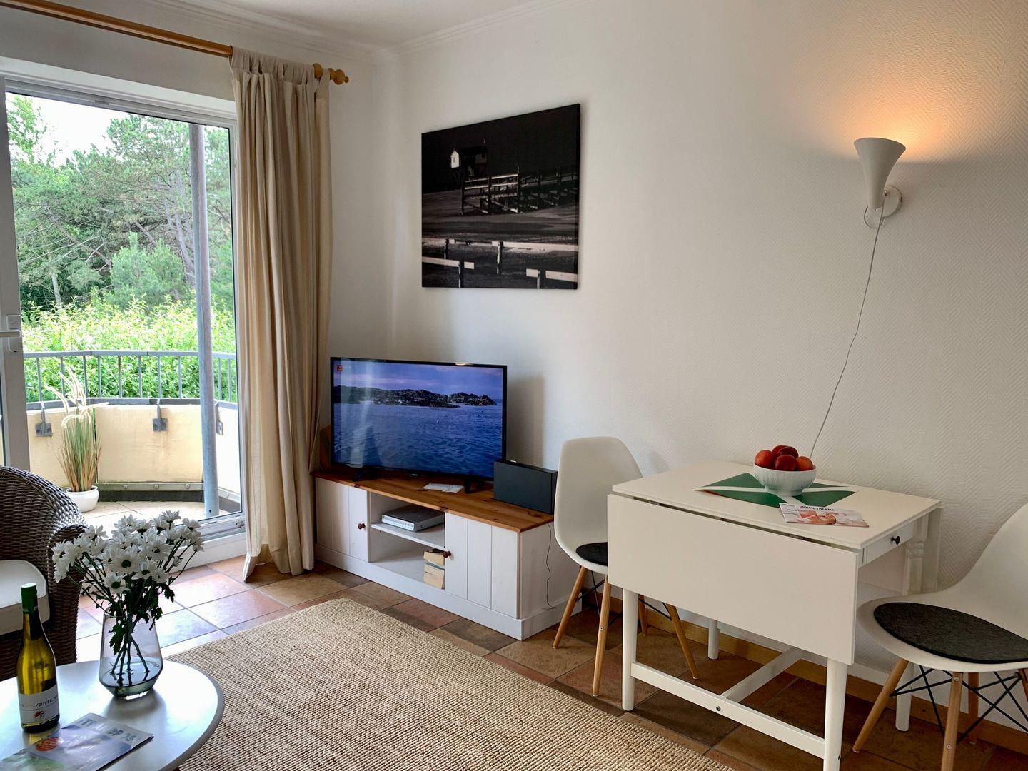 Hell und freundlicher Wohnraum mit Sofa, TV und integrierter Küchenzeile. Separates Schlafzimmer mit Doppelbett,