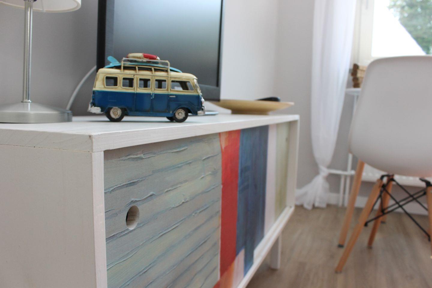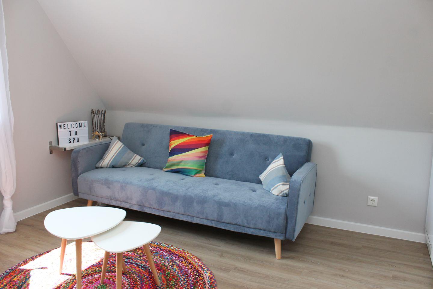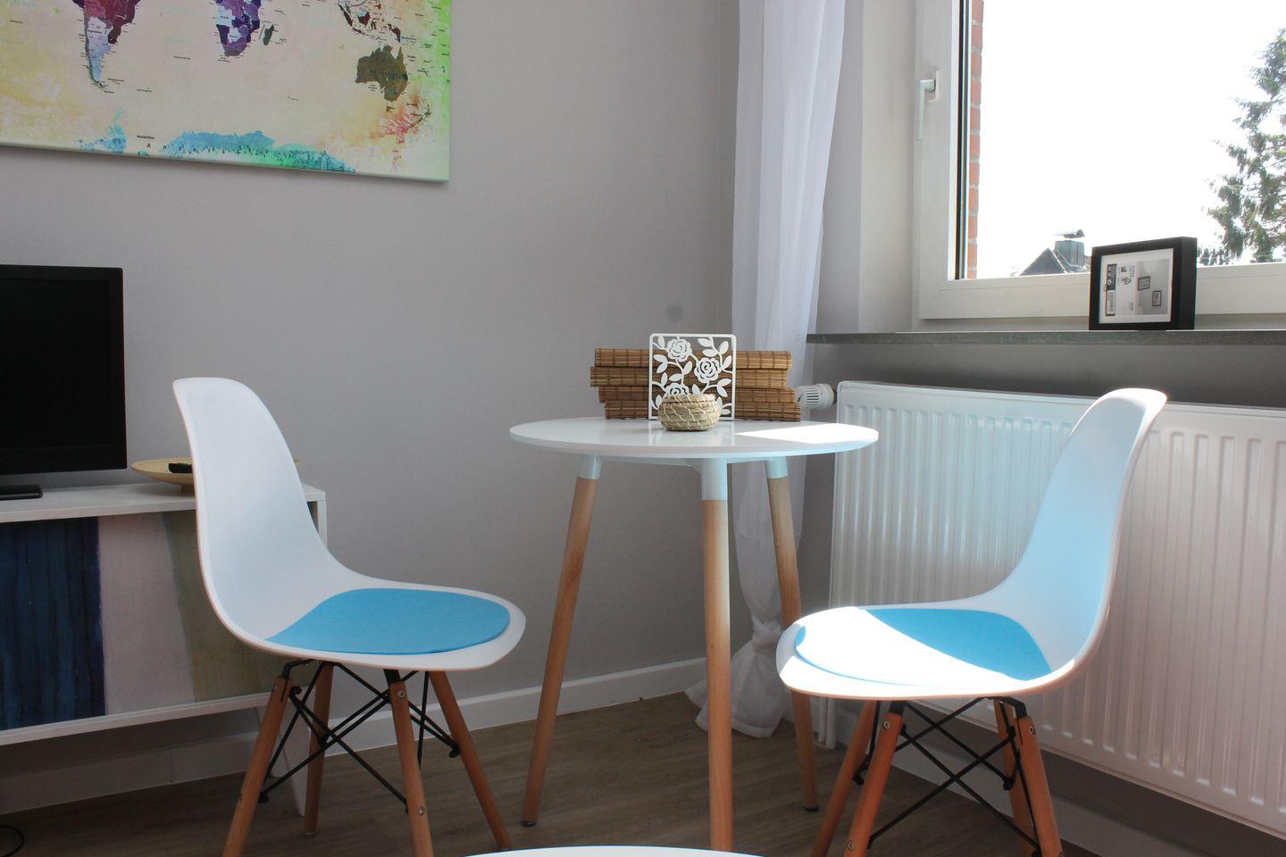 Der Wohnraum ist modern und hell gestaltet, er ist ausgestattet mit gemütlicher 120x200cm Schlafcouch, einer kleinen Essecke sowie einem Flachbild-TV. Kostenfreies W-LAN ist vorhanden.