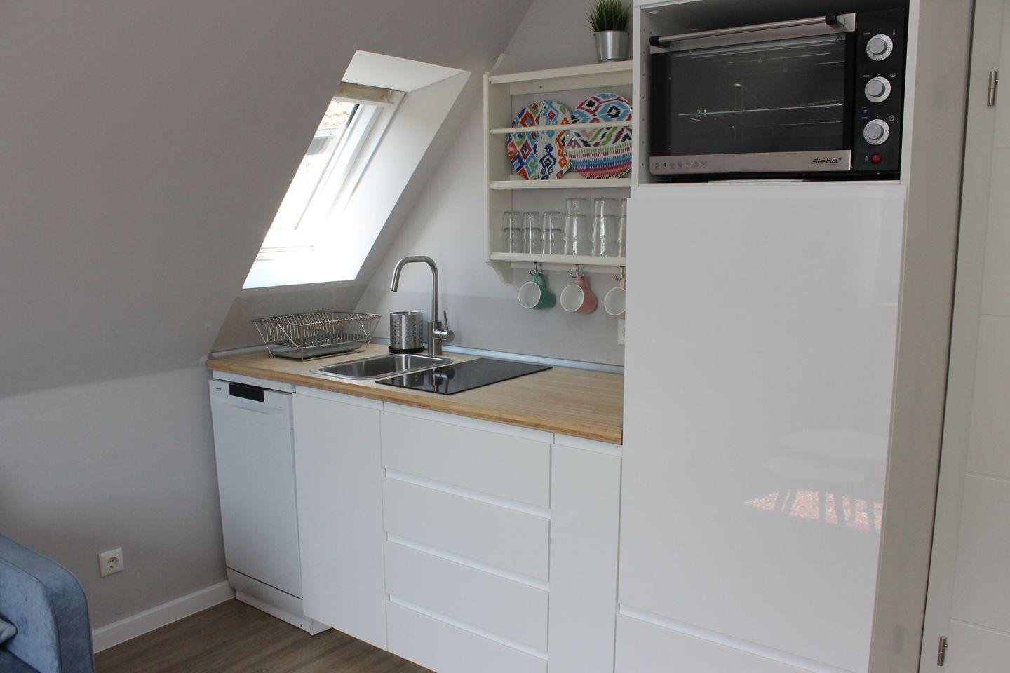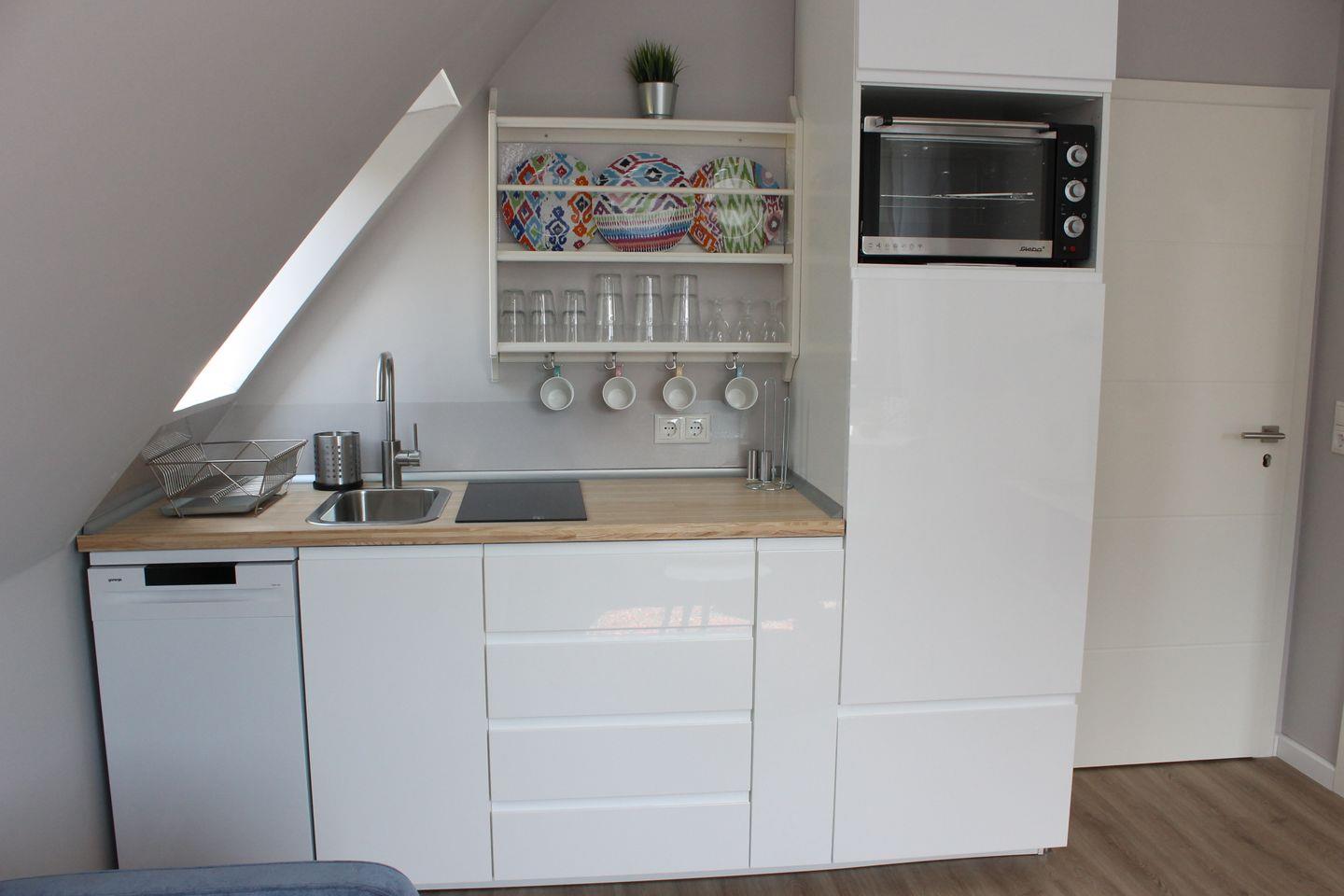 Die anliegende Küchenzeile ist gut ausgestattet und verfügt über Mikrowellenbackofen, Kühlschrank, Geschirrspüler und Kaffeemaschine.