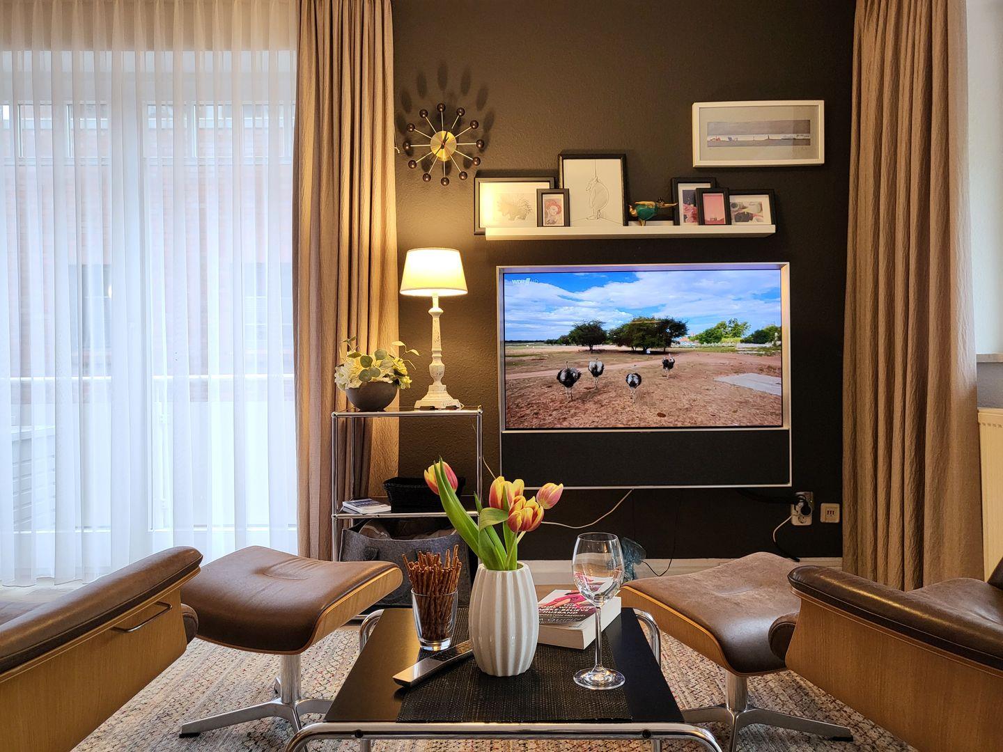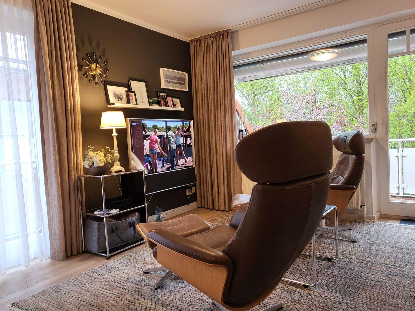 Das große, helle Wohnzimmer wirkt durch die große Fensterfront und den Übergang zum Balkon einladend und freundlich. Hier gehören eine gemütliche Couch sowie zwei komfortable Sessel samt Fußhocker zur Ausstattung. Für die multimediale Unterhaltung sorgen der große Flachbild-TV und kostenfreies W-LAN.