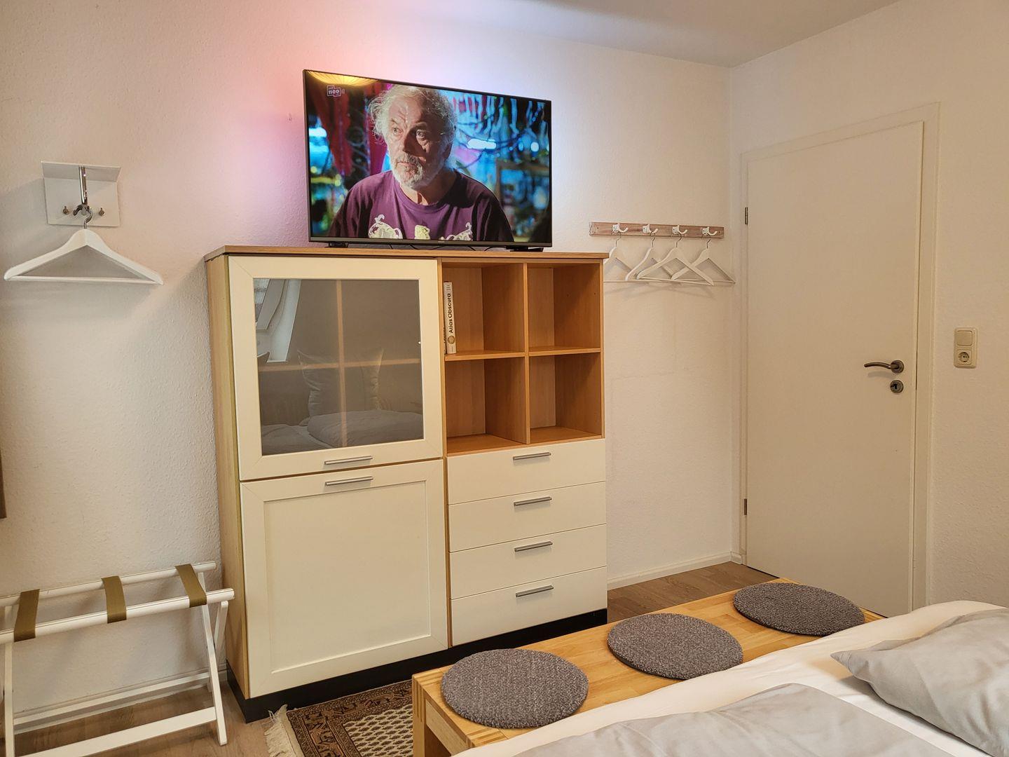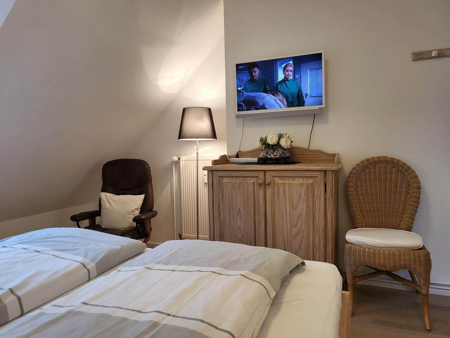 Ein Schlafzimmer mit großem 180x200cm Doppelbett ist ebenfalls auf der Etage. Hier steht ein weiterer Flachbild-TV zur Verfügung.