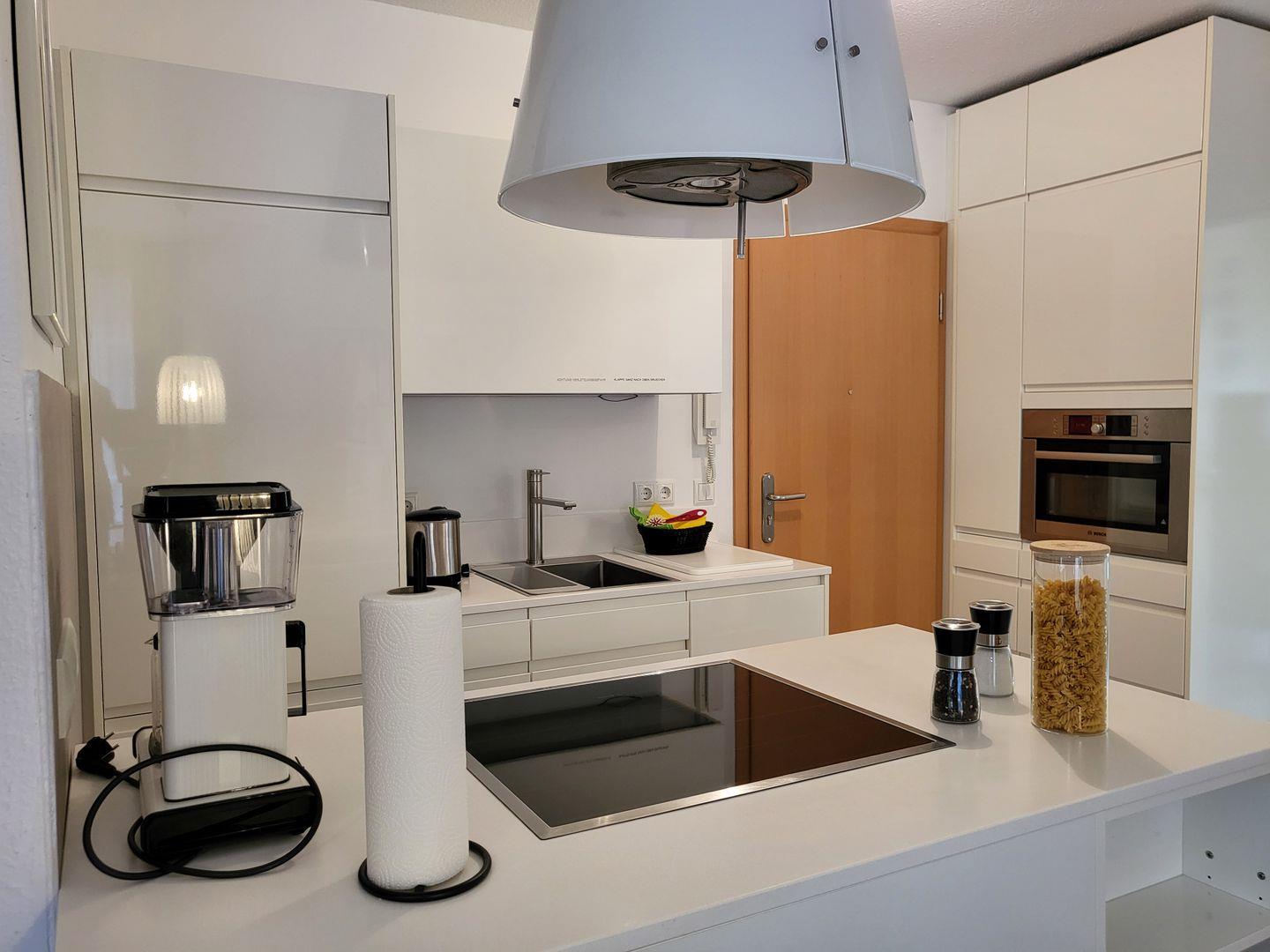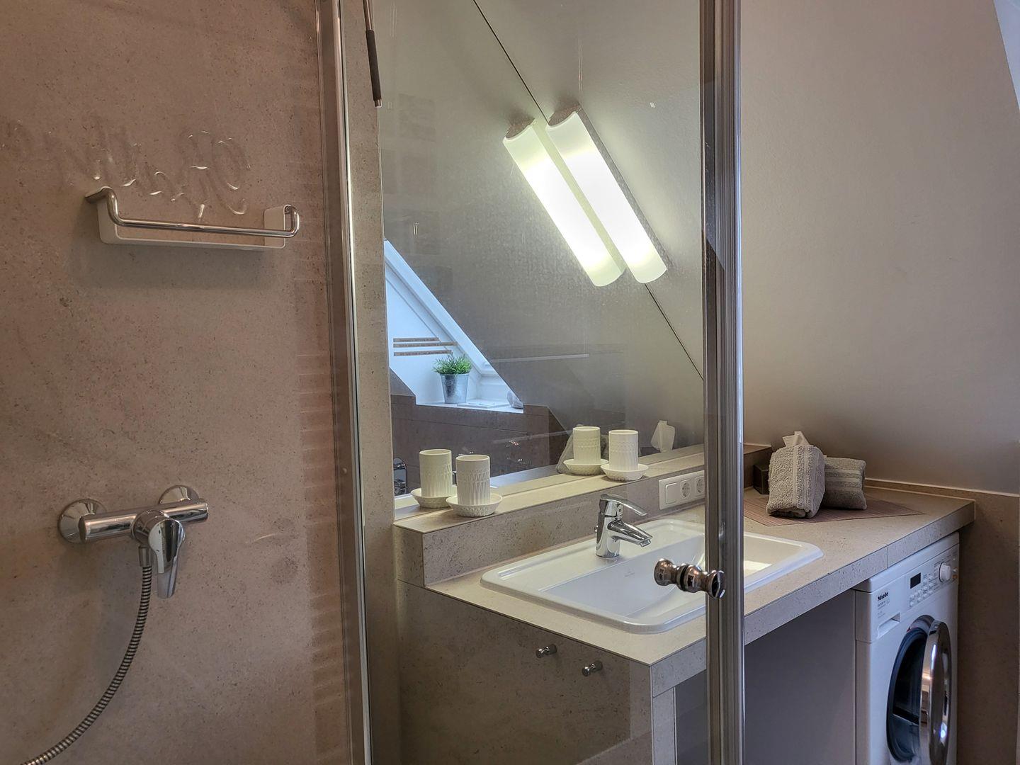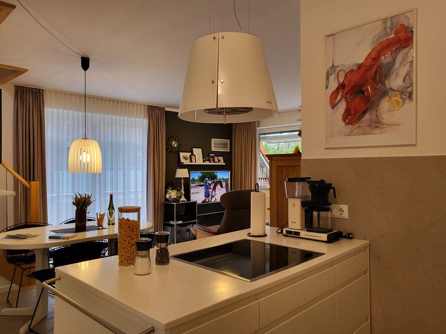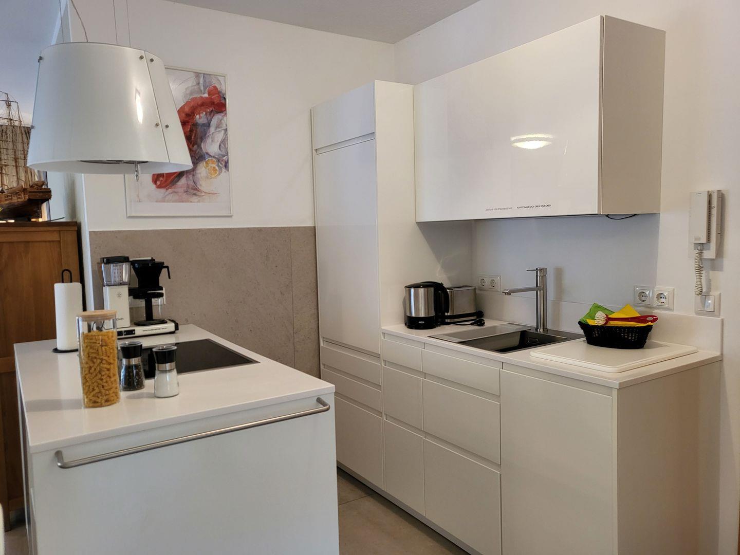 In den Raum integriert liegt die modern und hochwertig ausgestattete Küche. Ein großes Cerankochfeld gehört zusammen mit Backofen, Kühlschrank mit Gefrierfach sowie Geschirrspüler und Kaffeemaschine zur Ausstattung. Zur Ferienwohnung gehört ein helles Duschbad mit WC, im Badezimmer steht ein Waschtrockner bereit. Ein Kinderreisebett und ein Hochstuhl stehen zur Verfügung.