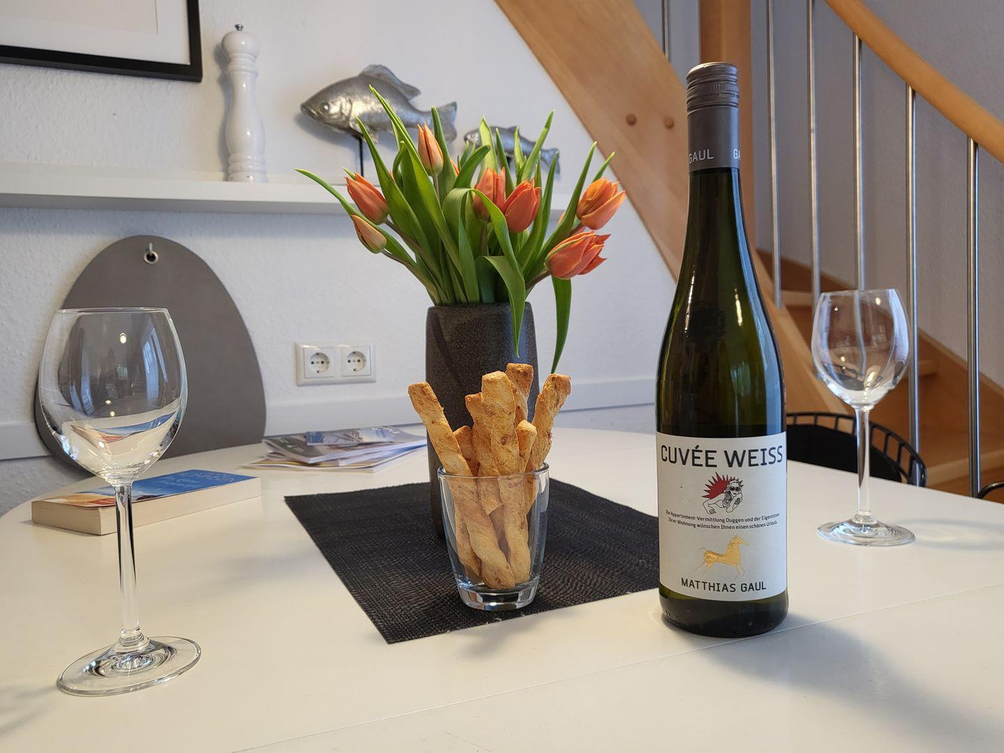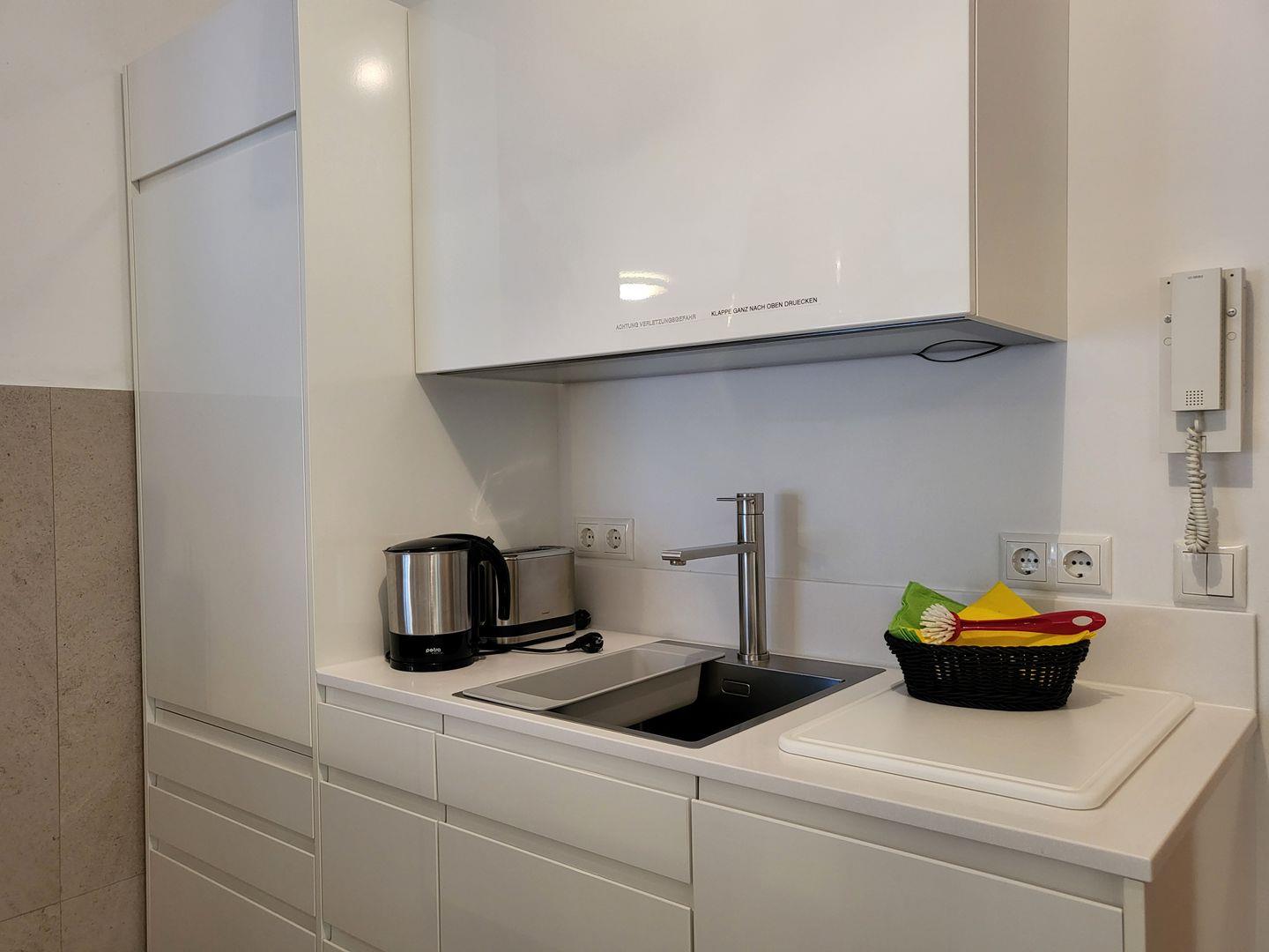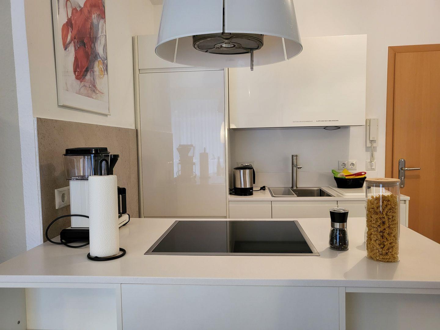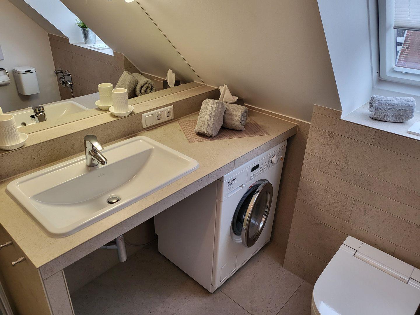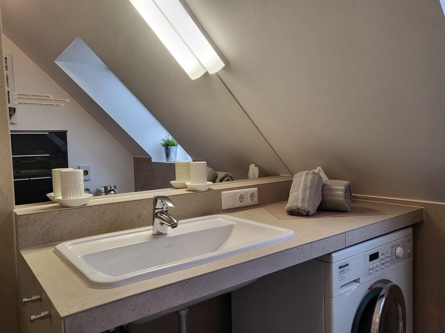 In den Raum integriert liegt die modern und hochwertig ausgestattete Küche. Ein großes Cerankochfeld gehört zusammen mit Backofen, Kühlschrank mit Gefrierfach sowie Geschirrspüler und Kaffeemaschine zur Ausstattung. Zur Ferienwohnung gehört ein helles Duschbad mit WC, im Badezimmer steht ein Waschtrockner bereit. Ein Kinderreisebett und ein Hochstuhl stehen zur Verfügung.