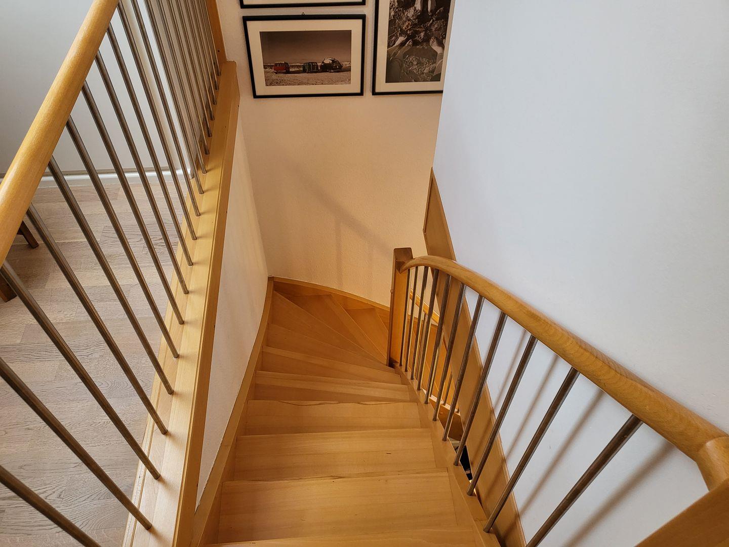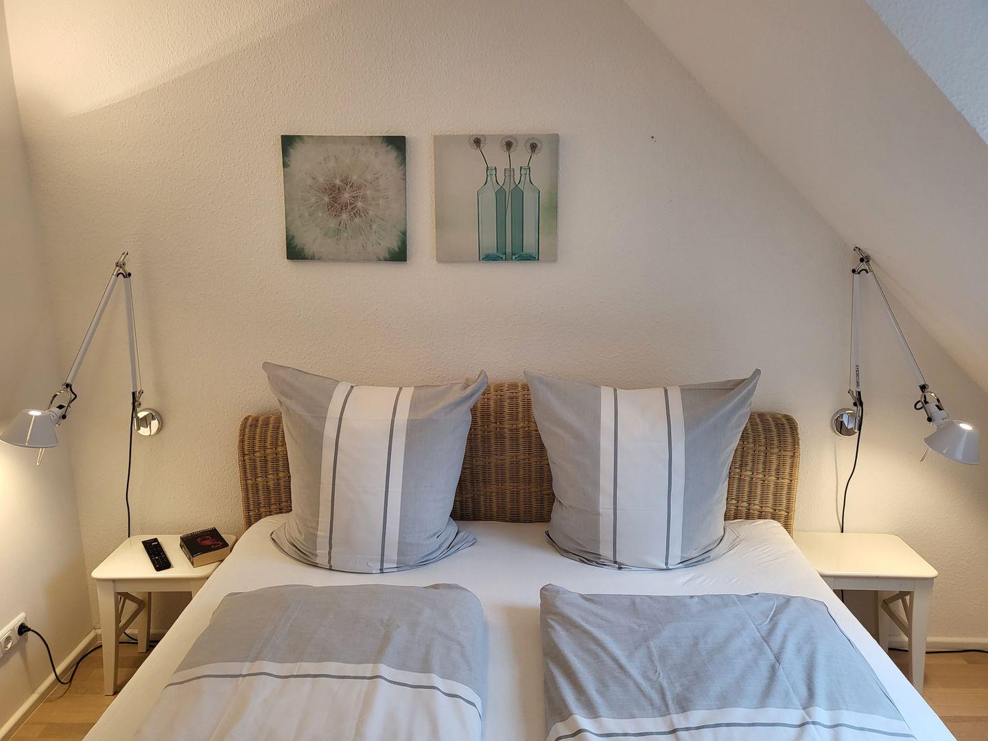 Eine geschwungene Treppe führt ins Dachgeschoss, in dem sich das zweite Schlafzimmer der Ferienwohnung befindet. Zur Ausstattung gehören ein großes 180x200cm Doppelbett, ein geräumiger Kleiderschrank sowie ein Flachbild-TV.