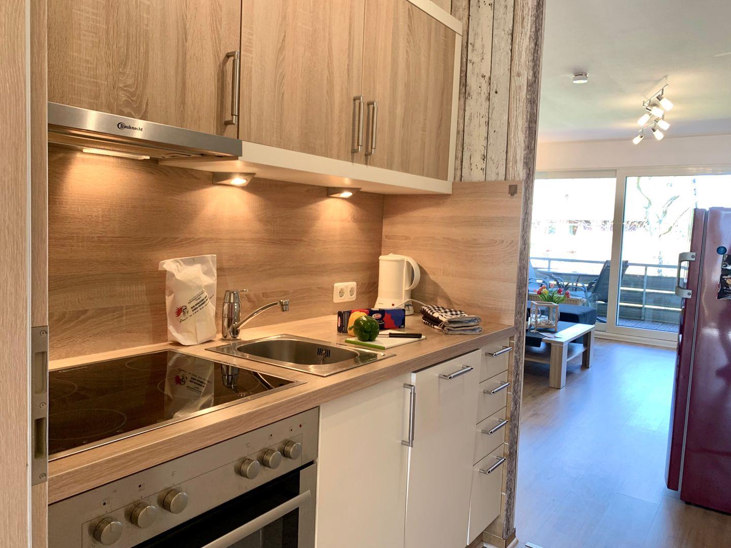 Die offene, sehr moderne Küchenzeile verfügt unter anderem über einen Backofen, ein großer Kühlschrank mit Gefrierfach sowie Kaffeemaschine und Geschirrspüler.