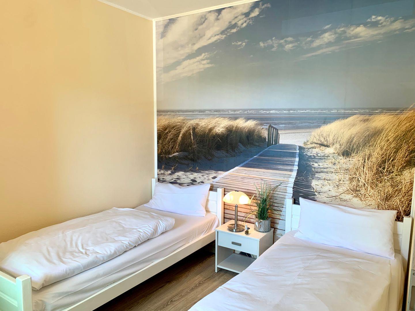 Modern eingerichtet und hell zeigt sich das geräumige Schlafzimmer mit 2 Einzelbetten. Zur Ferienwohnung gehört ein modernes, gut ausgestattetes Duschbad mit WC.