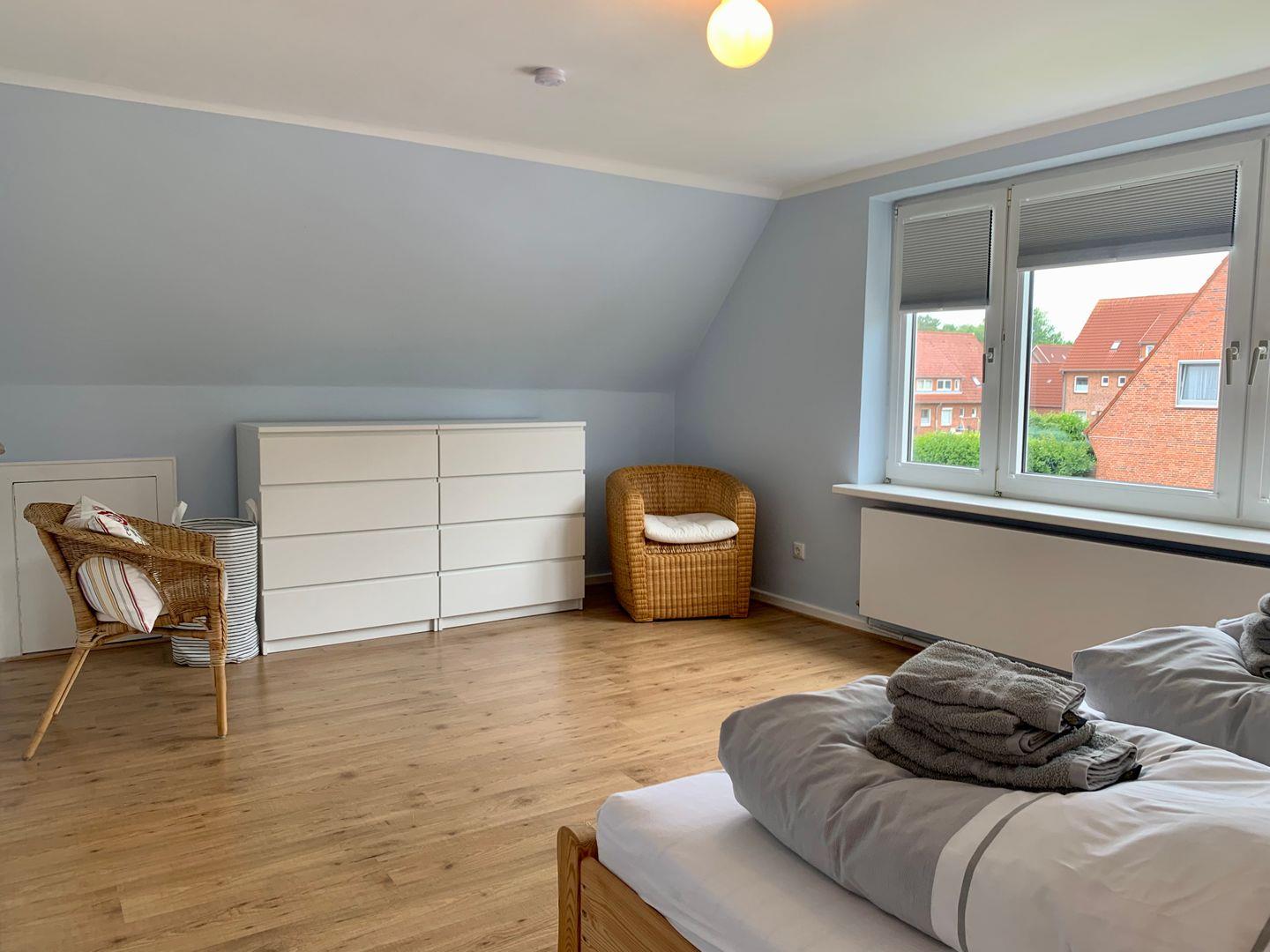 Der helle, kombinierte Wohn- und Essbereich ist ausgestattet mit einer gemütlichen Couch sowie einem Korbsessel. Für die multimediale Unterhaltung sorgen Flachbild-TV und kostenfreies W-LAN. Der Essbereich mit vier komfortablen Sitzplätzen grenzt an den Wohnbereich an. Die separate Küche ist modern und gut ausgestattet, sie verfügt unter anderem über Cerankochfeld, Kühlschrank, sowie Geschirrspüler und Kaffeemaschine. Im separaten Hauswirtschaftsraum steht ein Waschtrockner zur kostenfreien Nutzung bereit, ein Wäscheständer ist vorhanden. Ebenfalls im Erdgeschoss gelegen ist das große Badezimmer, dieses ist mit WC und bodengleicher Dusche ausgestattet. Im Obergeschoss sind drei komfortable Schlafzimmer eingerichtet. Das Elternschlafzimmer verfügt über ein großes 180x200cm Doppelbett sowie eine Kommode und einen Korbsessel.