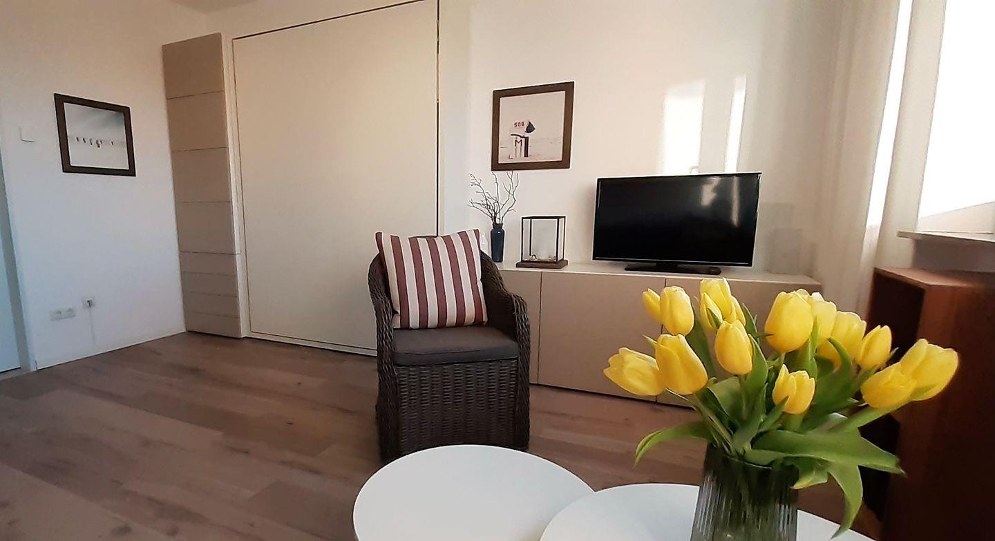 Helle 1-Zimmer Ferienwohnung mit Seeblick in der 7. Etage. Kombinierter Wohn- und Schlafraum mit bequemer Sofaecke,