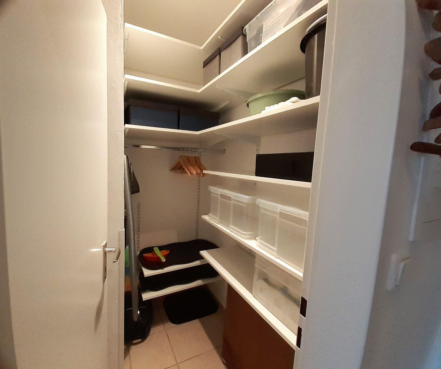 einem modernen Schrankbett. Eine gut ausgestattete Küchenzeile, einer kleiner Flur mit Abstell- und Kleiderkammer sowie Duschbad mit WC sind vorhanden.