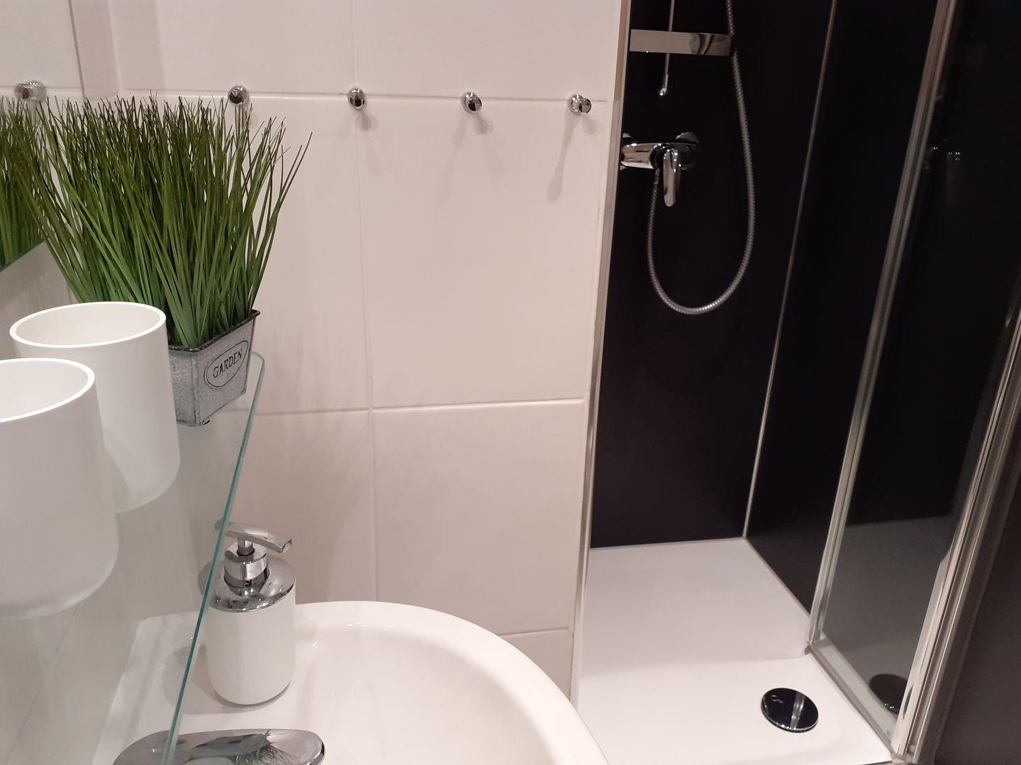 Zur Ferienwohnung gehört ein modernes Duschbad mit WC sowie ein elektrischen Handtuchtrockner.
