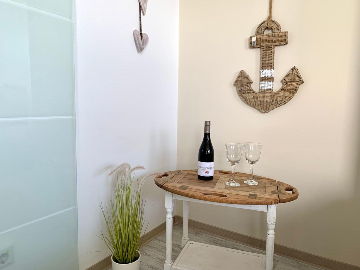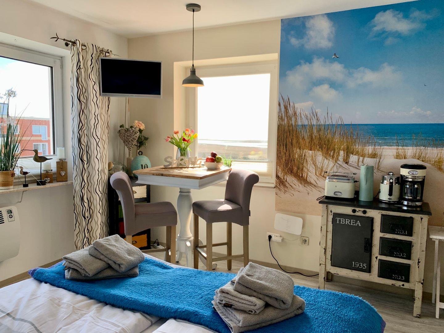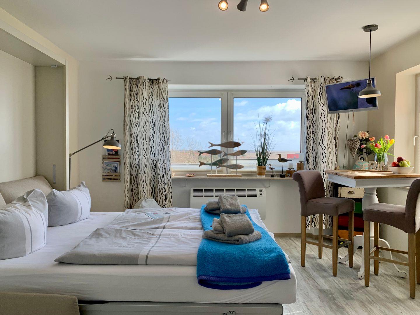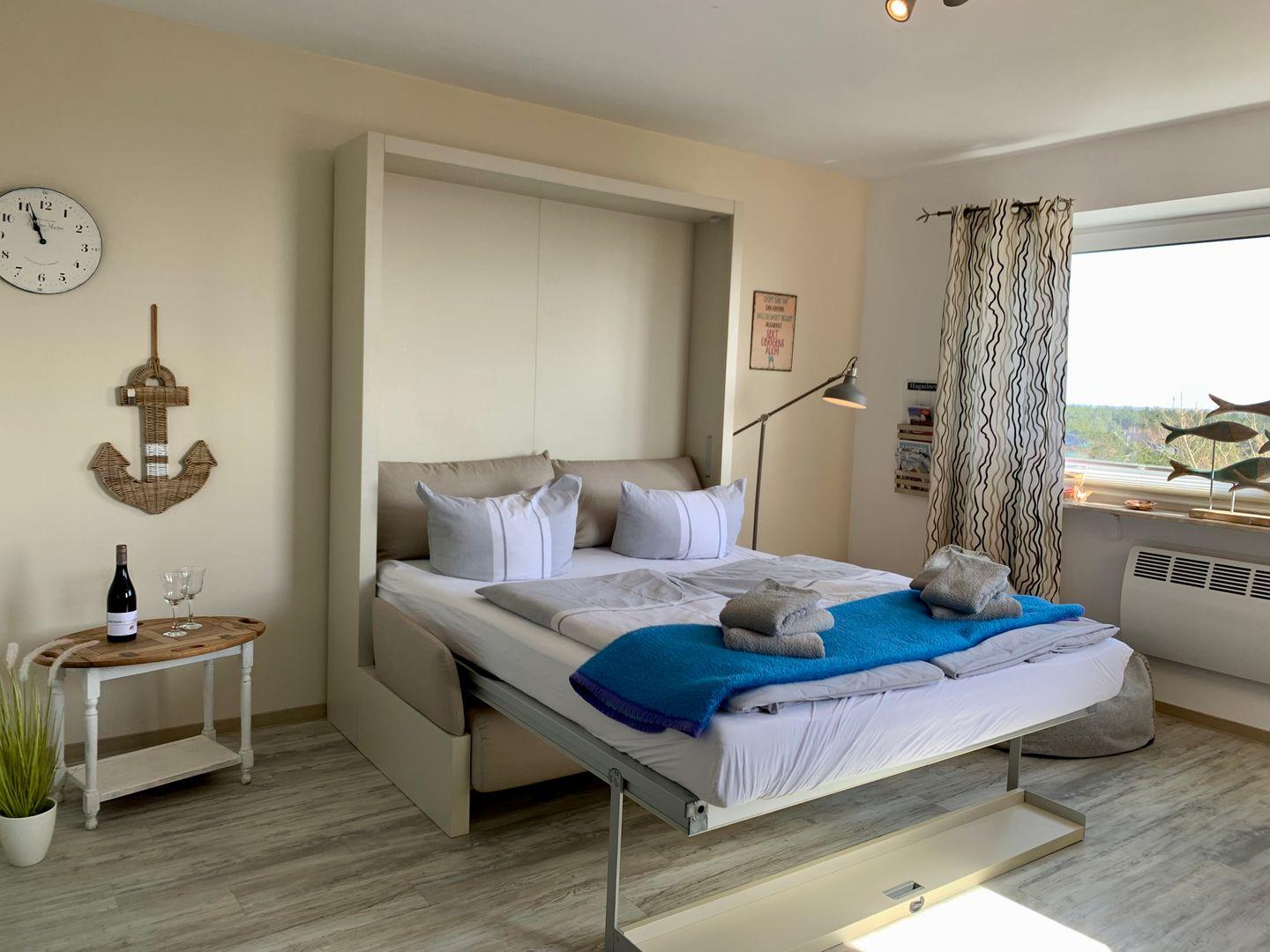 Durch die große Fensterfront wirkt der kombinierte Wohn- und Schlafraum wunderbar hell und einladend – Hier fühlt man sich direkt gut aufgehoben. Zur Ausstattung gehört hier das komfortable und überaus praktische Schrankbett, dass tagsüber einer gemütlichen Couch weicht. Beim Essen schweift der Blick ins Grüne, für die multimediale Unterhaltung in der Ferienwohnung mit Meerblick sorgen Flachbild-TV und kostenfreies W-LAN.