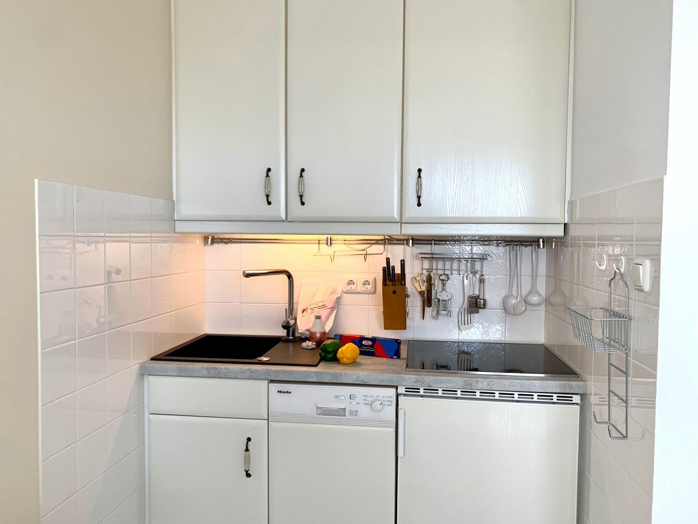 Die integrierte Küche ist gut ausgestattet und biete unter anderem Kochfeld, Kühlschrank mit Gefrierfach sowie Kaffeemaschine.