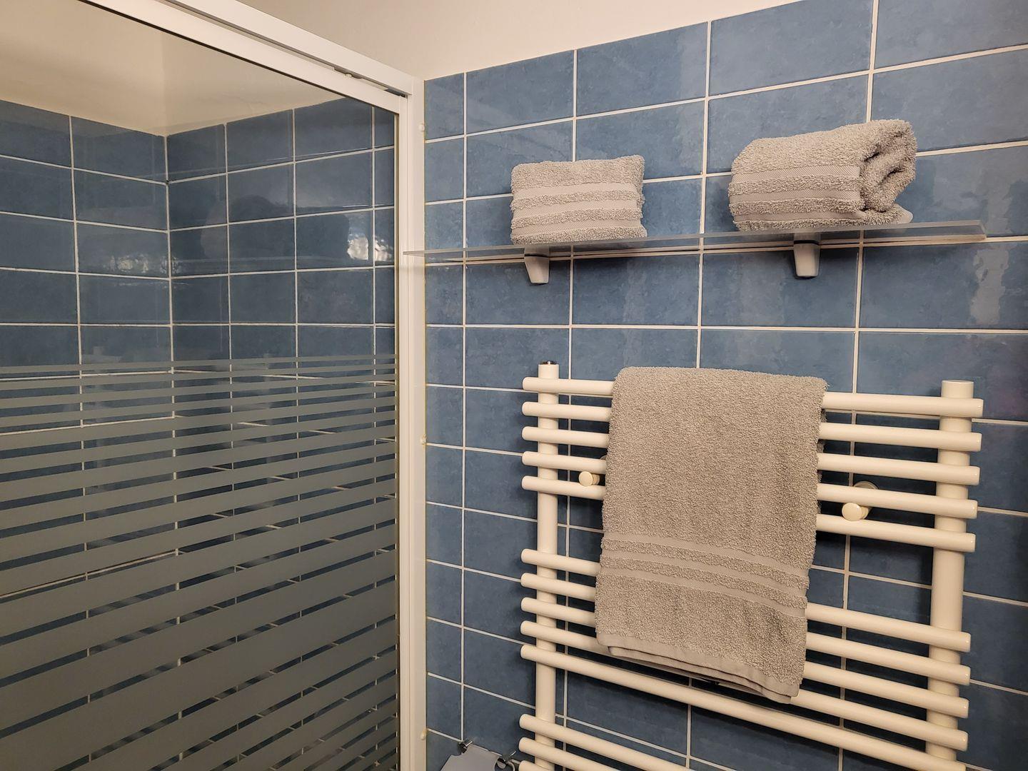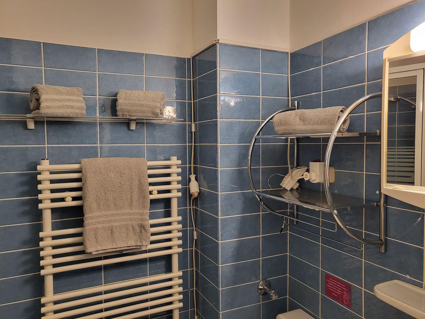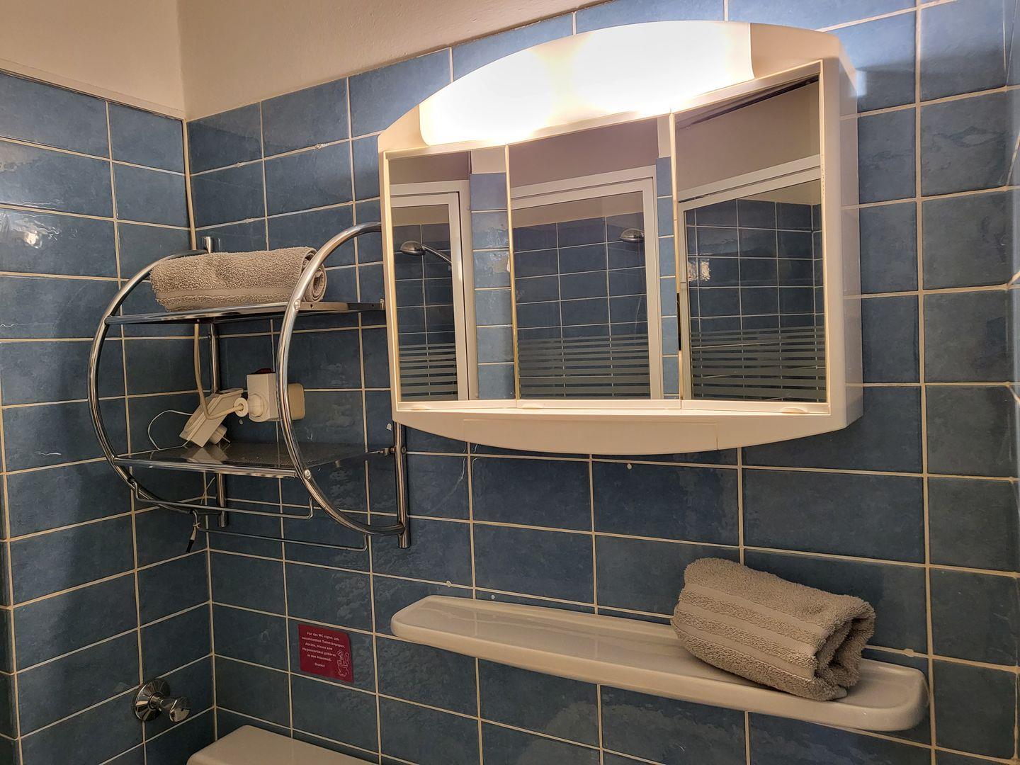 Ein separates Schlafzimmer mit 160x200cm Doppelbett steht zur Verfügung. Zur Ferienwohnung gehört zudem ein Duschbad mit WC.