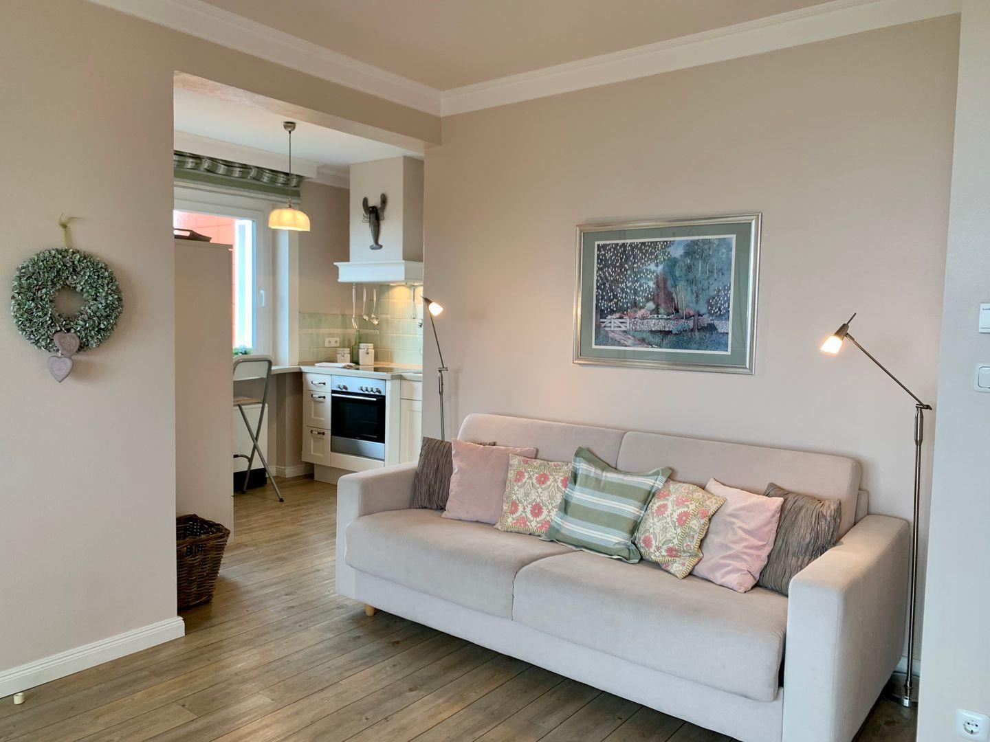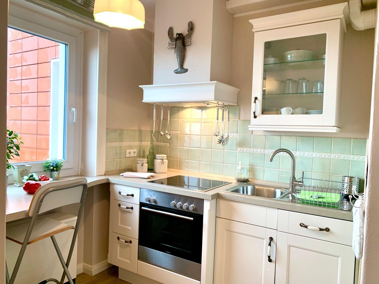 Die angrenzende Küche ist mit einer hochwertigen Küchenzeile versehen, hier gehören unter anderem Cerankochfeld und Backofen sowie Kühlschrank mit Gefrierfach sowie Geschirrspüler und Kaffeemaschine zur Ausstattung. Zur Ferienwohnung gehört ein Dushcbad mit WC.