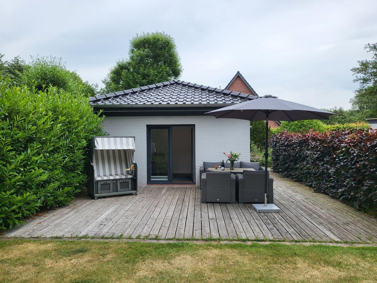 Wegen der Lage und Ausstattung eignet sich das Ferienhaus wunderbar für den Familienurlaub, Kinder sind hier herzlich willkommen. Auch der Urlaub mit Hund ist hier auf Anfrage möglich. Zum Ferienhaus gehört eine große, möblierte Terrasse mit typisch norddeutschem Strandkorb und ein großes Gartengrundstück, das zum Sonnen uind Spielen einlädt.