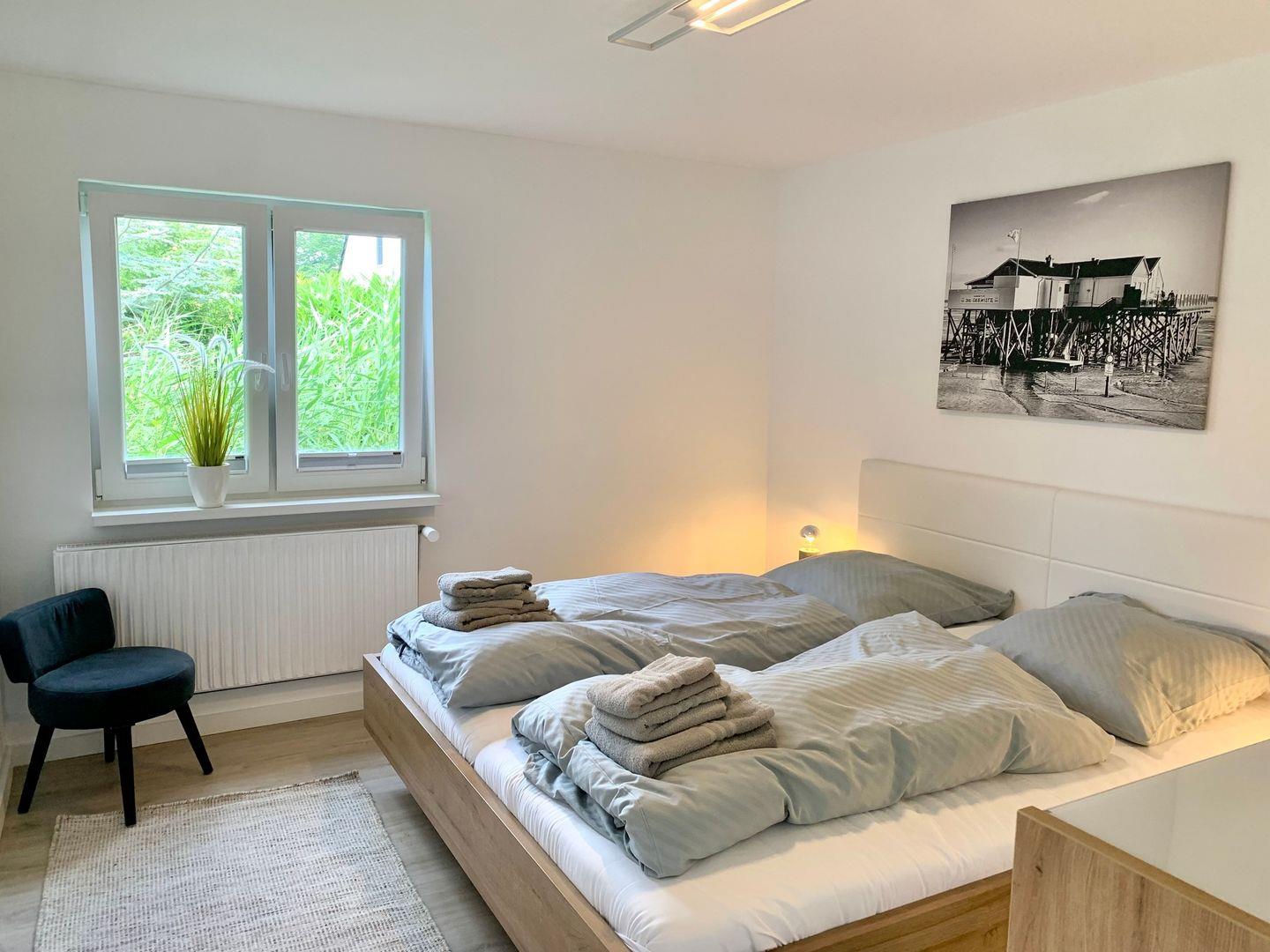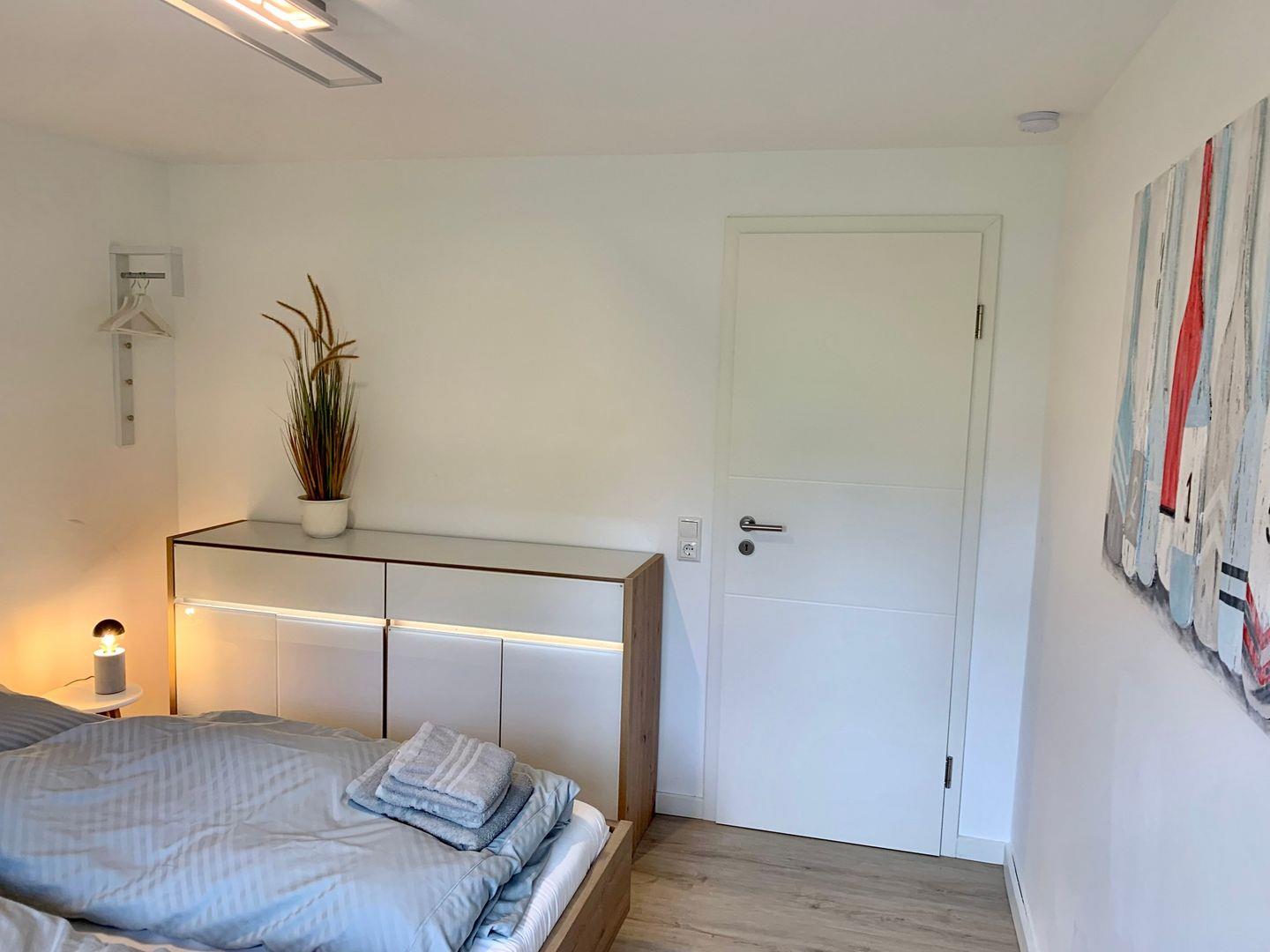 Das Ferienhaus im Ortsteil Böhl verfügt über zwei separate Schlafzimmer. Eines ist ausgestattet mit einem großen 180x200cm Doppelbett, im zweiten steht ein Einzelbett mit Bettschublade zur Verfügung. Ein helles Duschbad und WC gehört ebenfalls zur Ausstattung des Ferienhauses.