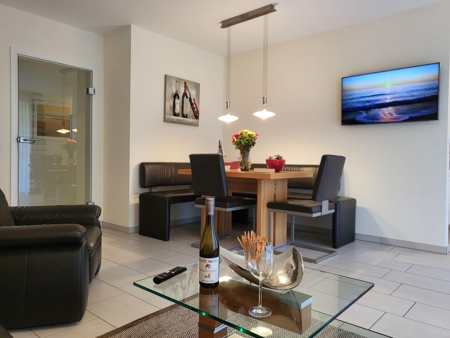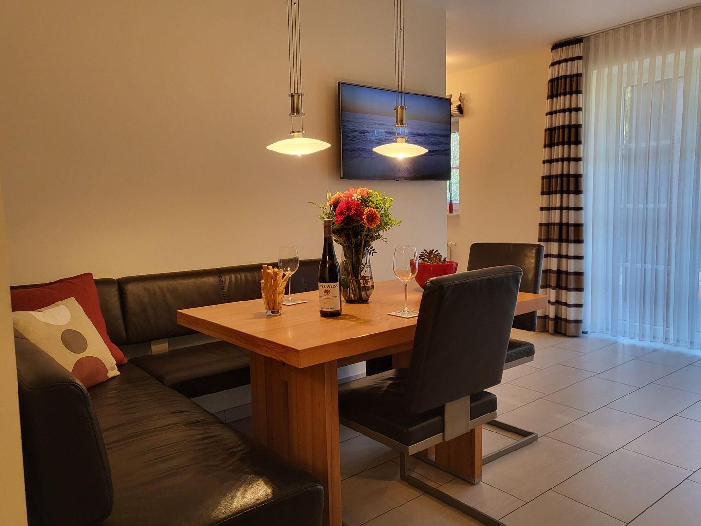 Durch den Übergang zur Terrasse wirkt das Wohnzimmer wunderbar hell und einladend. Eine edle Ledersitzgarnitur stehend aus Sofa, Sessel und Fußhocker laden zu entspannten Stunden ein, für die multimediale Unterhaltung sorgt der große Flachbild-TV und das kostenfreie W-LAN. Im TV sind alle Mediatheken voreingestellt, das Gerät ist Netflix-Kompatibel. Am Esstisch findet die gesamte Familie Platz und genießt das tolle Ambiente im gemütlich eingerichteten Wohnraum.