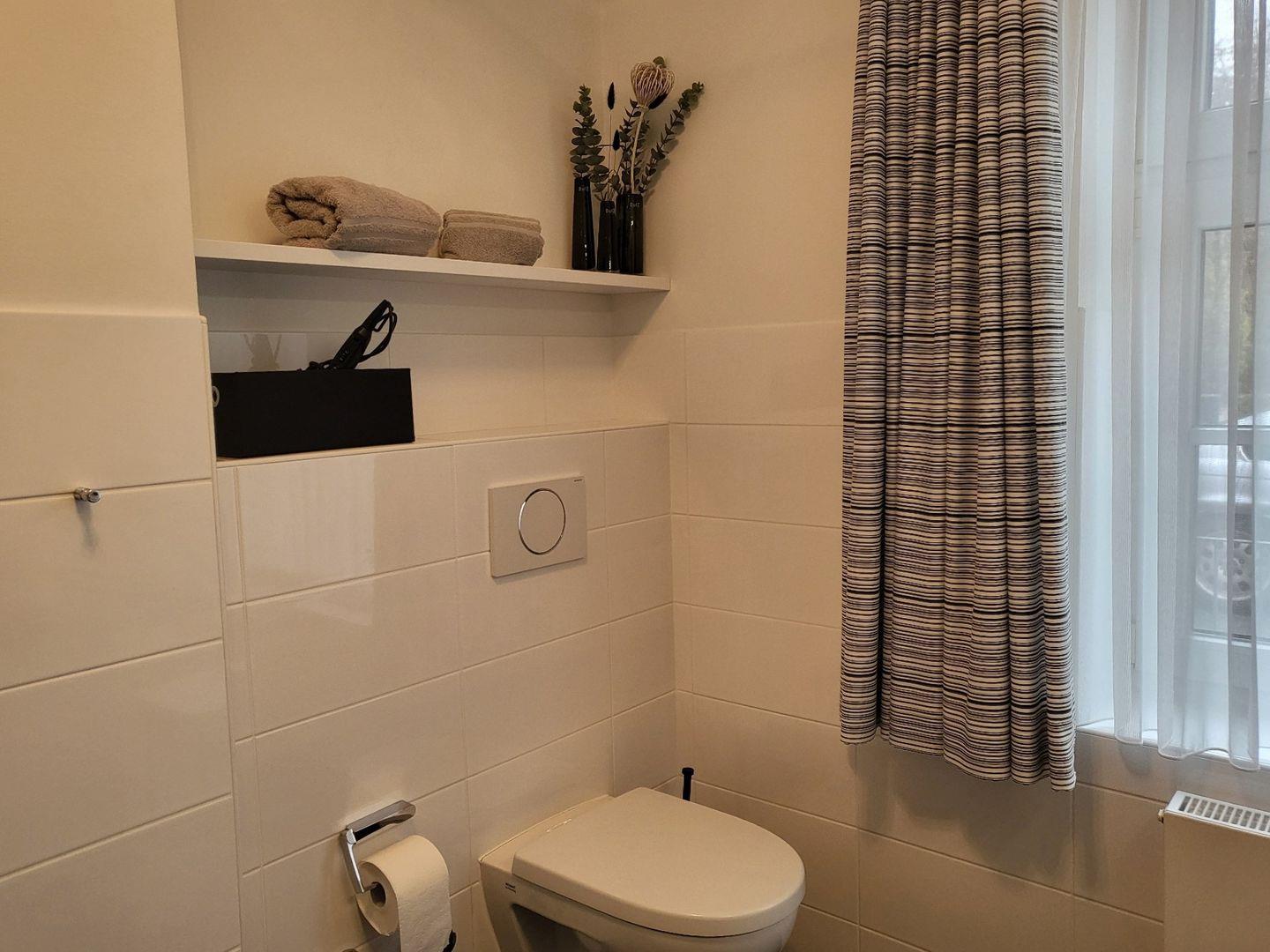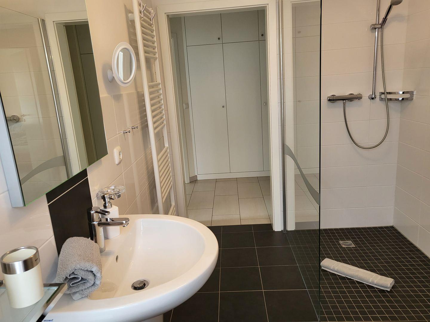 Das Badezimmer der Ferienwohnung verfügt über eine ebenerdige Dusche, einen Handtuchhalter sowie WC und Waschtisch und ein Insektenschutzgitter.