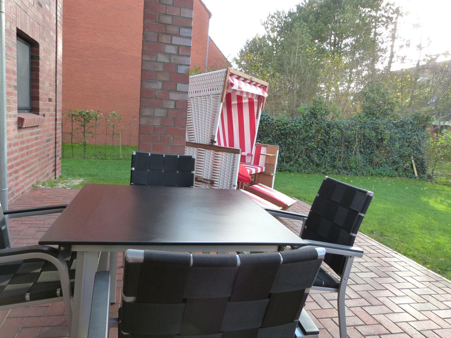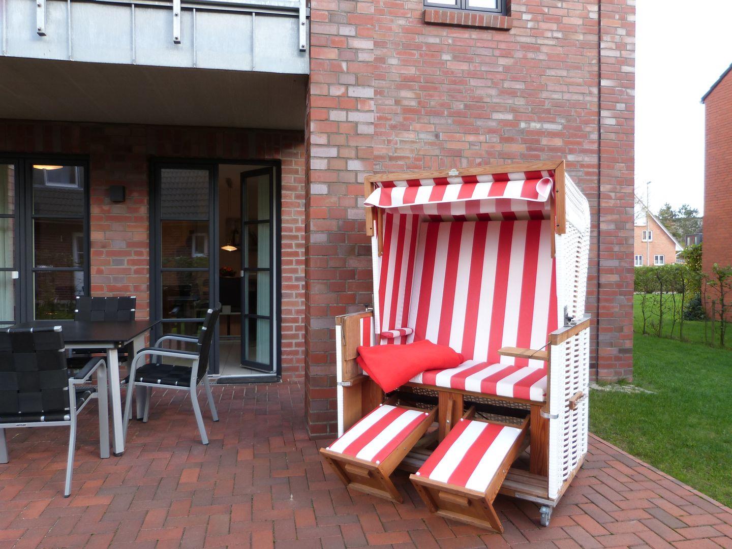 Die möblierte Terrasse lädt zu schönen Stunden im Freien ein – während der Saison ist hier ein typisch norddeutscher Strandkorb zu finden.