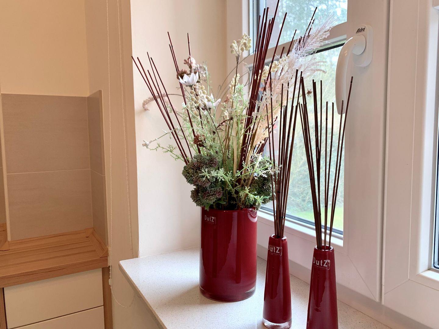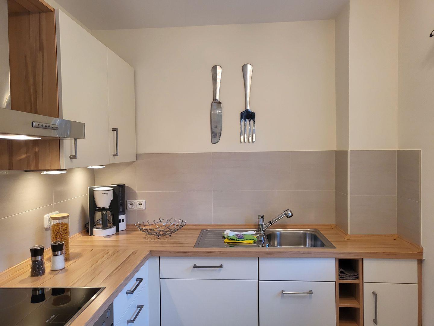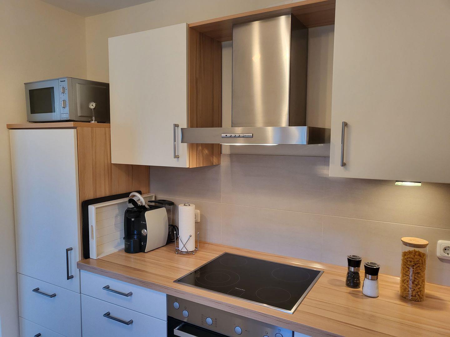 Zur Ausstattung gehören unter anderem ein großes Cerankochfeld und Backofen sowie ein Kühlschrank mit Gefrierfach. Ebenfalls sind Mikrowelle, Kaffee- und Kaffee-Pad-Maschine vorhanden, ein Geschirrspüler steht zur Verfügung.