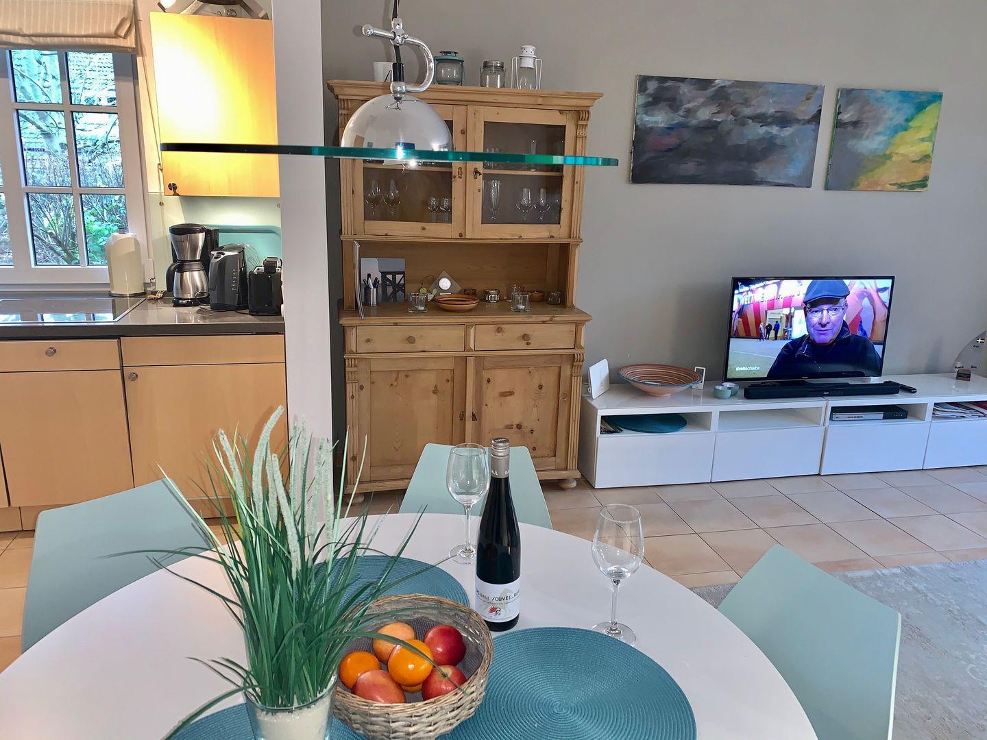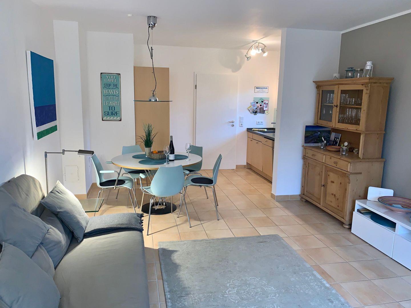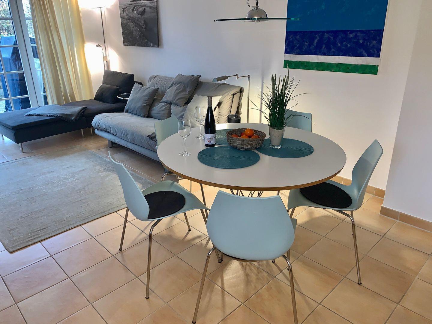 Das helle, ansprechend eingerichtete Wohnzimmer lädt mit einem urgemütlichen Sofa und einer komfortablen Liege zu gemütlichen Stunden ein. Für die multimediale Unterhaltung sorgt der große Flachbild-TV mit DVD und Blue-Ray-Player sowie kostenfreies W-LAN, am Esstisch genießen bis zu 5 Personen das Urlaubs-Dinner.